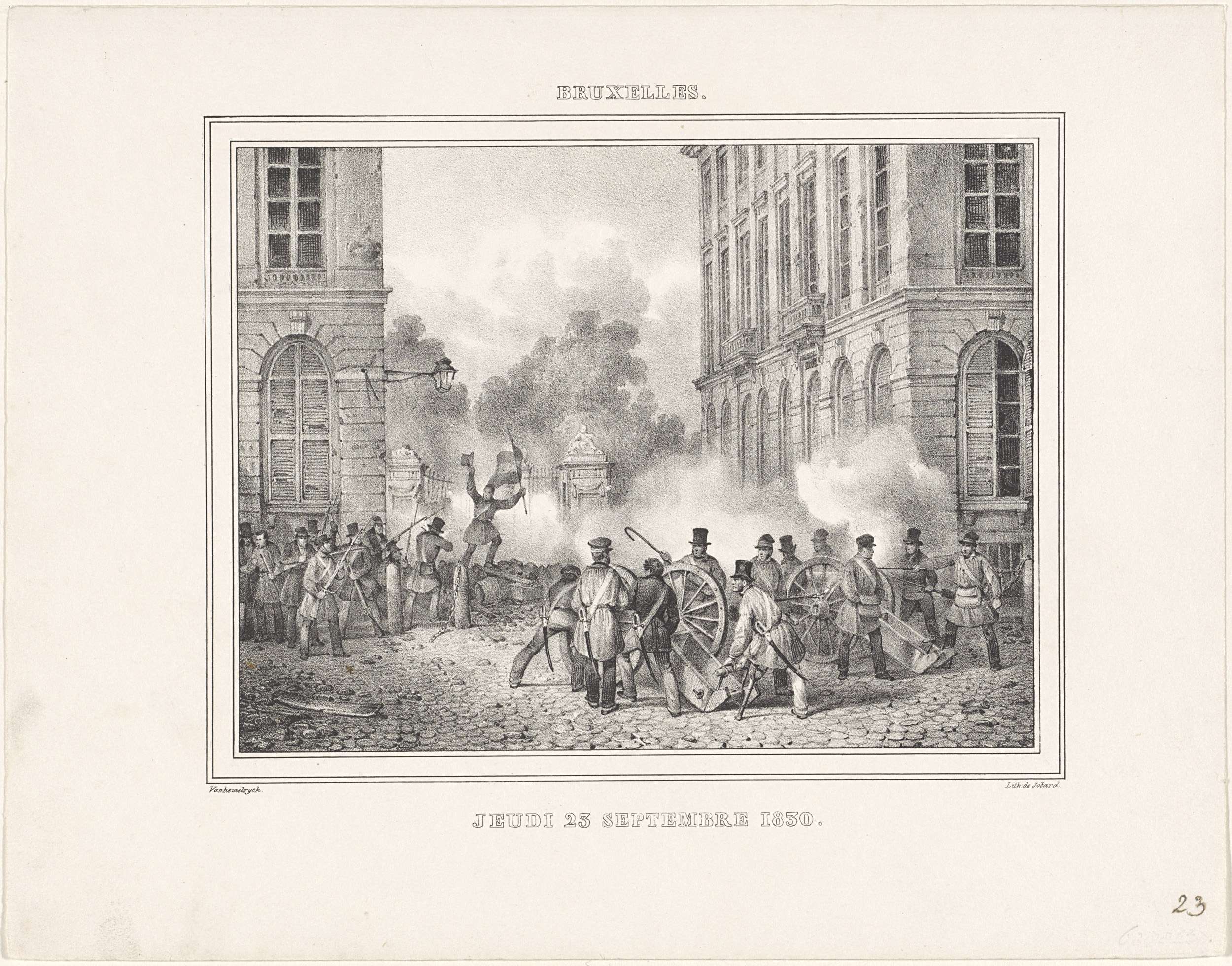 Belgische opstandelingen achter een barricade bij het Warandepark te Brussel op 23 september 1830. Achter één kanonnen staat Jambe de Bois. Onderdeel van een groep van prenten uit verschillende andere series verwant aan de platen in het recueil over de gebeurtenissen tijdens de Belgische Revolutie in Brussel, Antwerpen en andere steden in de periode 25 ...