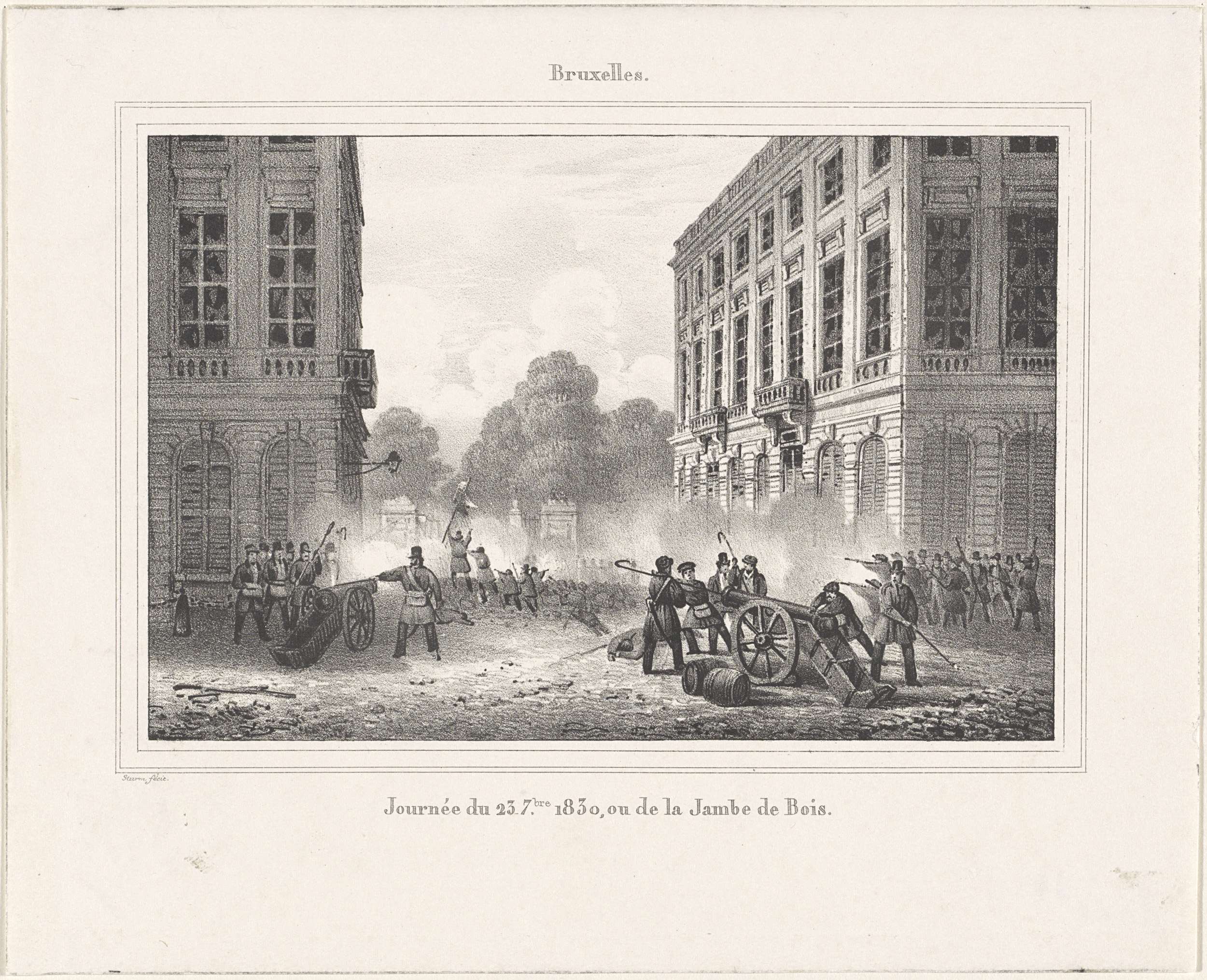 Gevechten in een straat bij de ingang naar het park. De Belgische opstandelingen, waaronder Jambe de Bois, schieten met kanonnen op de Nederlandse troepen, 23 september 1830. Onderdeel van een groep van prenten uit verschillende andere series verwant aan de platen in het recueil over de gebeurtenissen tijdens de Belgische Revolutie in Brussel, Antwerpen en ...