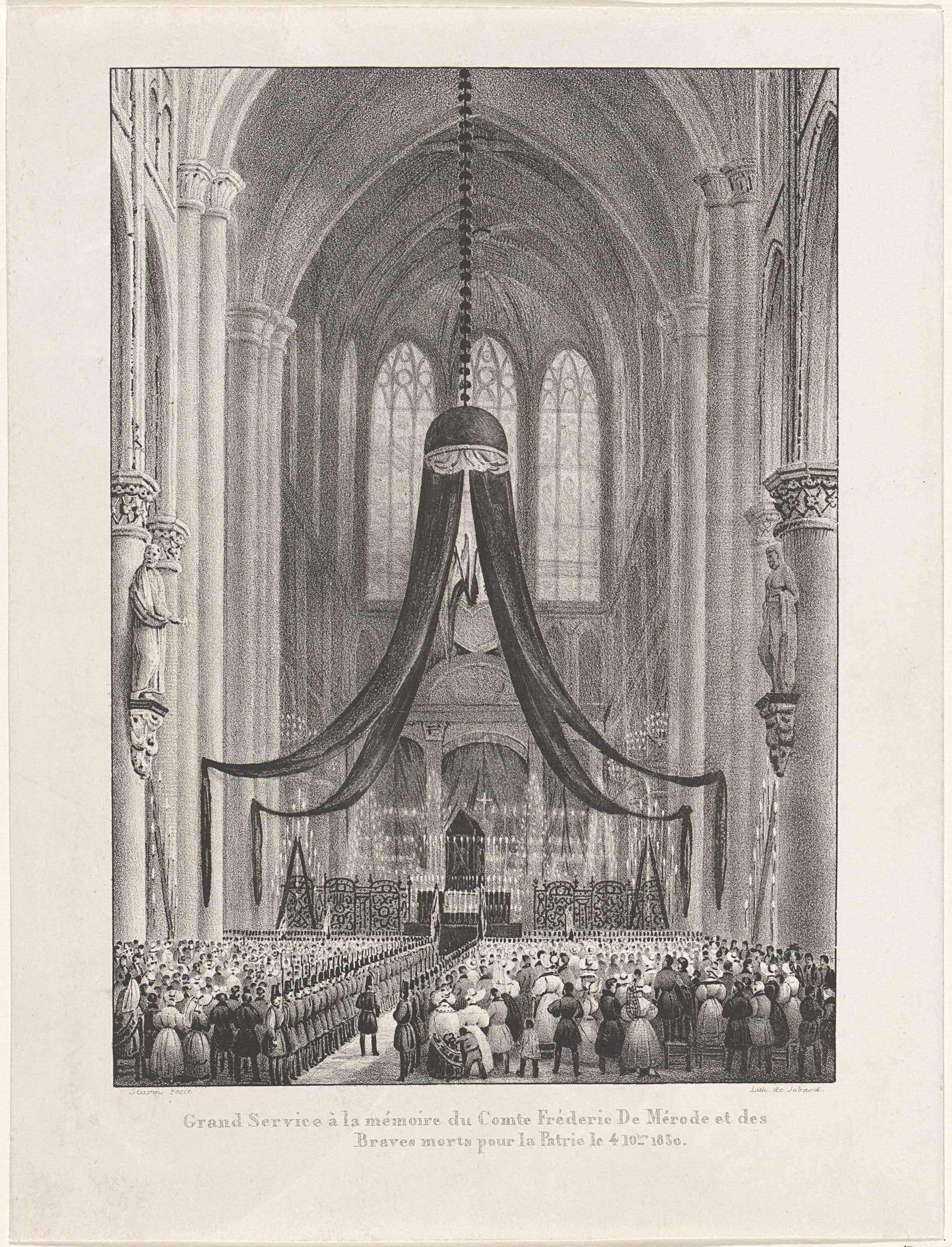 Eredienst voor Frédéric de Merode en andere gevallenen in een kerk op 4 december 1830. De Merode was één van de leiders van de Opstand en raakte gewond tijdens een treffen met Nederlandse troepen op 24 oktober bij Berchem. Hij overleed op 4 november. Onderdeel van een groep van prenten uit verschillende andere series verwant ...
