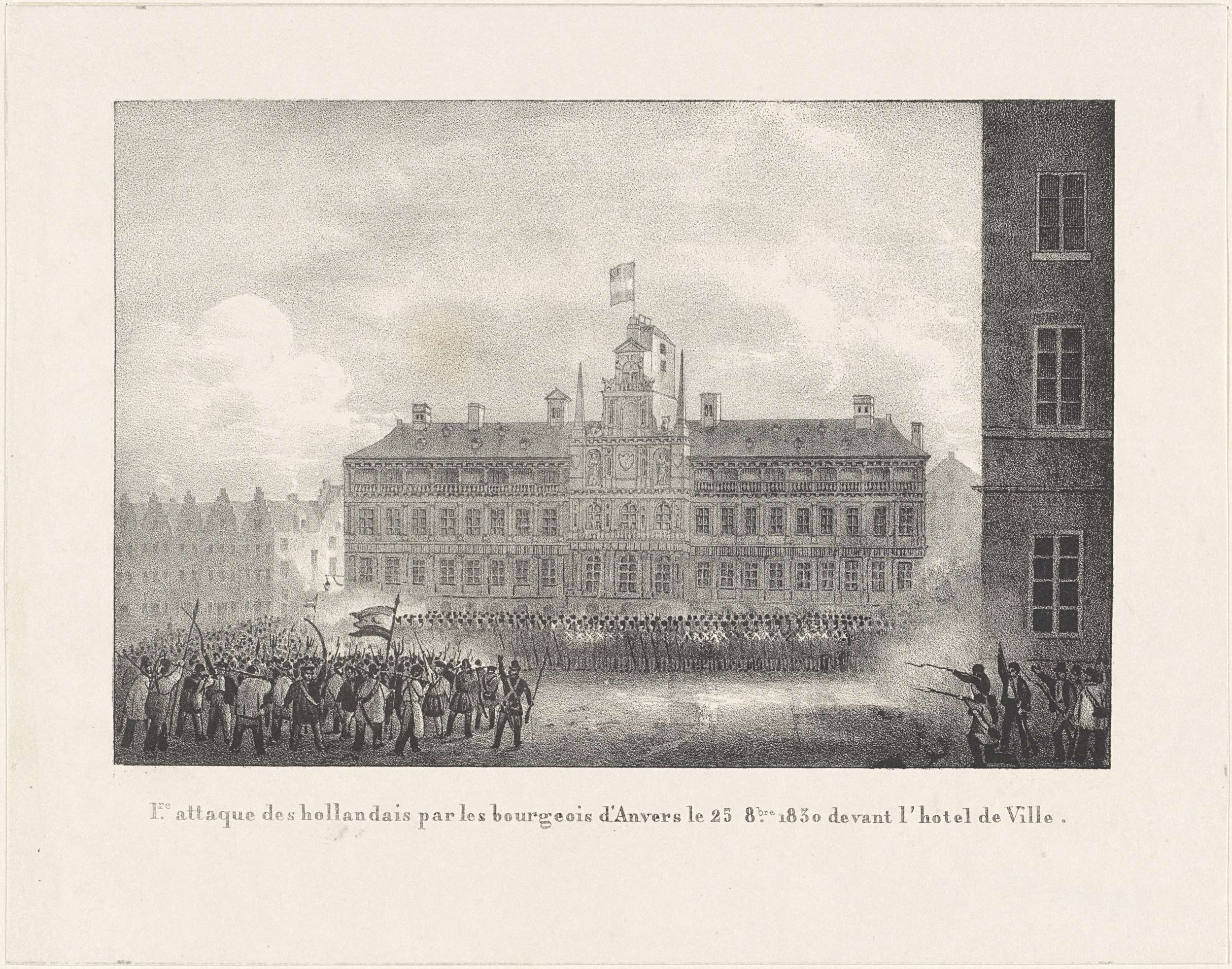 Eerste aanval door de burgerij op de Nederlandse troepen voor het stadhuis van Antwerpen, 25 oktober 1830. Onderdeel van een groep van prenten uit verschillende andere series verwant aan de platen in het recueil over de gebeurtenissen tijdens de Belgische Revolutie in Brussel, Antwerpen en andere steden in de periode 25 augustus 1830 tot 27 ...