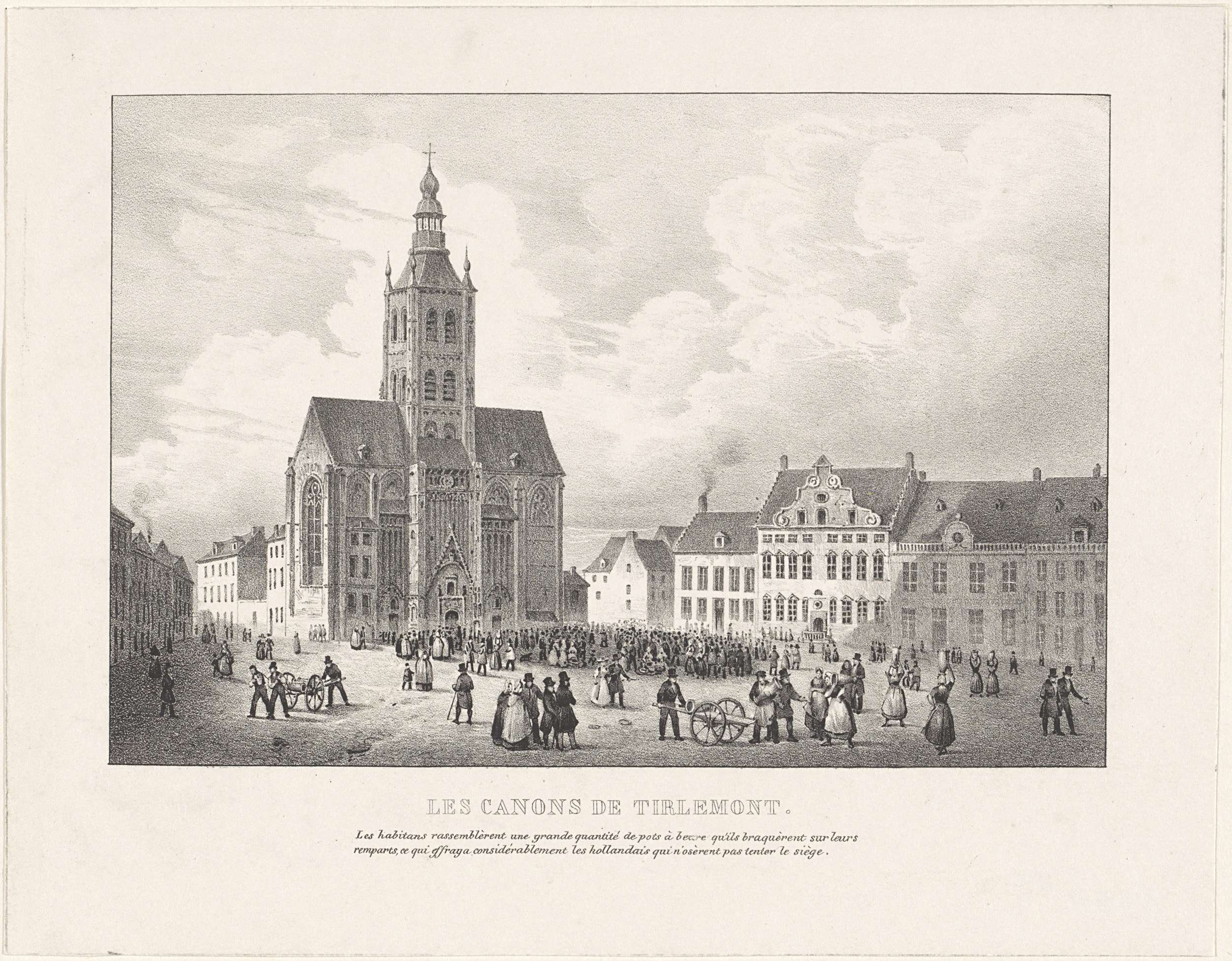 De kanonnen van Tienen. De inwoners van Tienen brengen een grote hoeveelheid boterpotten, die leken op de lopen van kanonnen, samen op hun vestingmuren, wat de Hollanders dermate afschrok dat ze een beleg van de stad niet aandurfden, 23 september 1830. Onderdeel van een groep van prenten uit verschillende andere series verwant aan de platen ...