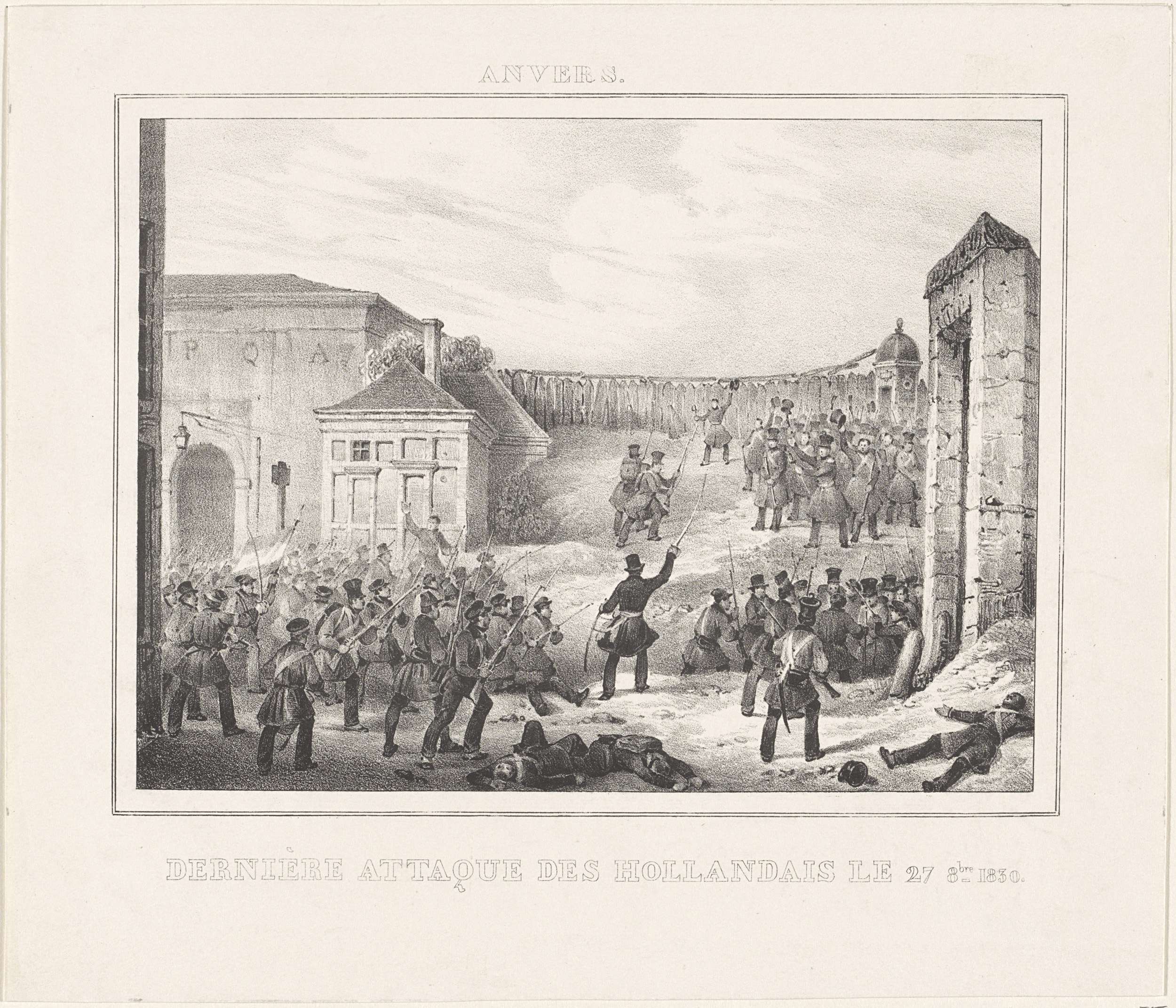 Laatste aanval door Belgische opstandelingen op de Nederlandse troepen in Antwerpen, 27 oktober 1830. Rechts een stadspoort. Onderdeel van een groep van prenten uit verschillende andere series verwant aan de platen in het recueil over de gebeurtenissen tijdens de Belgische Revolutie in Brussel, Antwerpen en andere steden in de periode 25 augustus 1830 tot 27 ...
