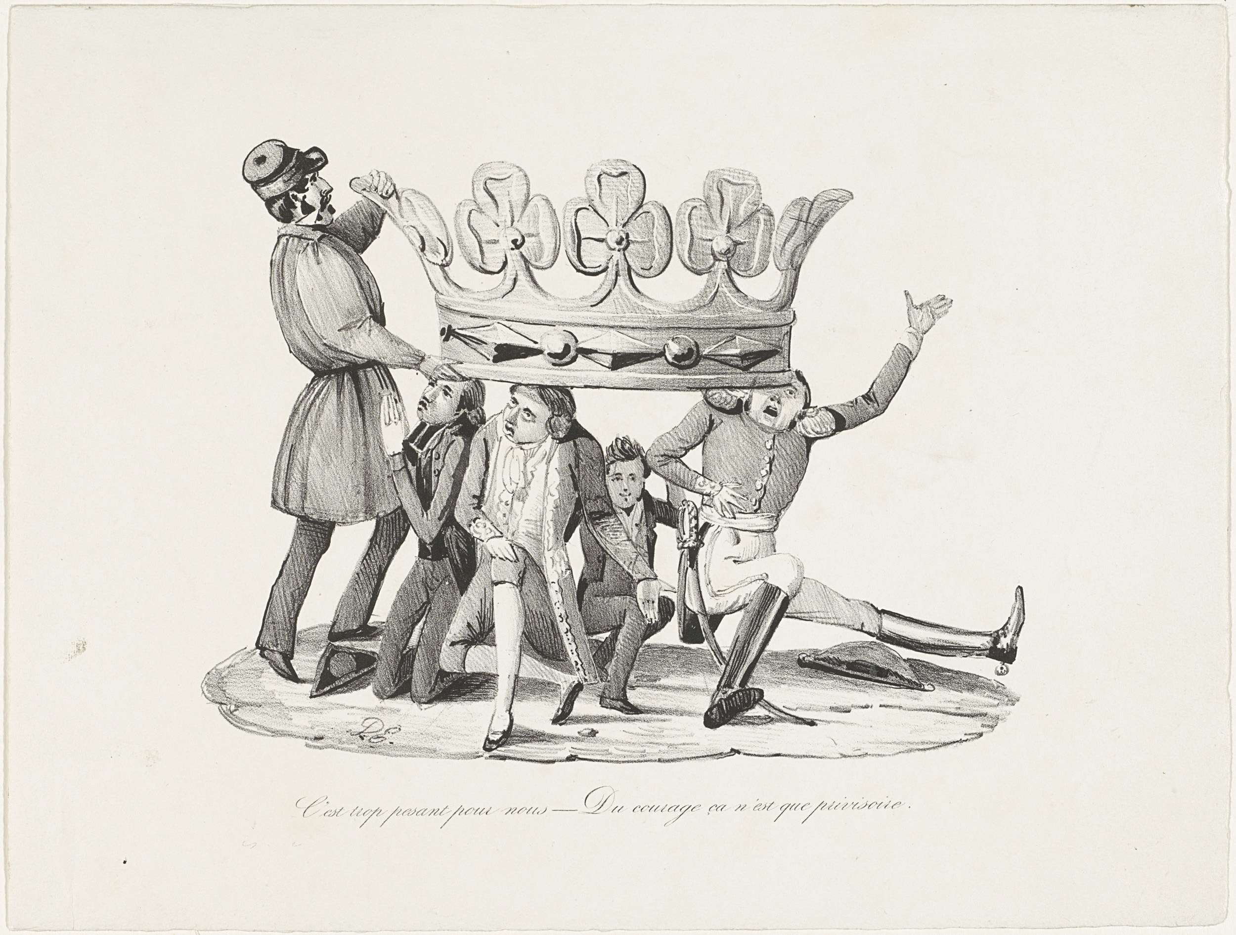 Spotprent op de leden van het Voorlopig Bewind van België in 1830. Een Belgische vrijwilliger plaatst de kroon op de hoofden van drie leden van de voorlopige regering die haast bezwijken onder de zware last. Een vierde man vermijdt glimlachend het dragen van de last van de kroon.