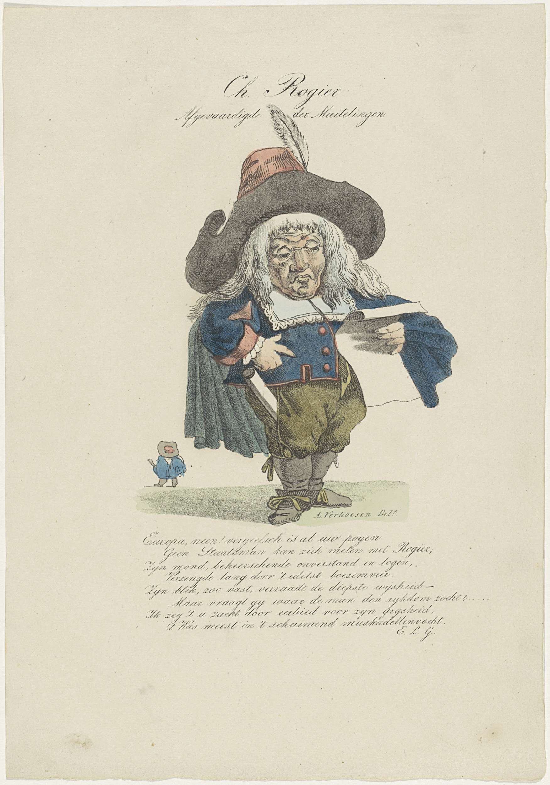 Spotprent op de verschillende leden van het Voorlopig Bewind van België in 1830. Charles Rogier als Afgevaardigde der Muitelingen, voorgesteld als een kleine mens (karikatuur) met lang haar en een grote hoed met veer, een document lezend. Met achtregelig versje.