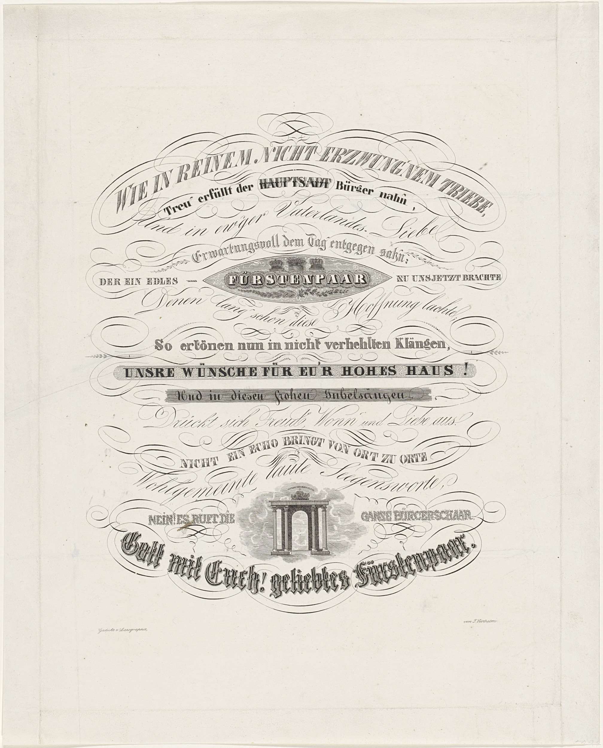 Gelukwens in kalligrafie bij het huwelijk van prinses Marianne met prins Albert van Pruisen, 19 september 1830. Gelukwensen in het Duitse veertienregelige vers, onderaan een triomfboog.