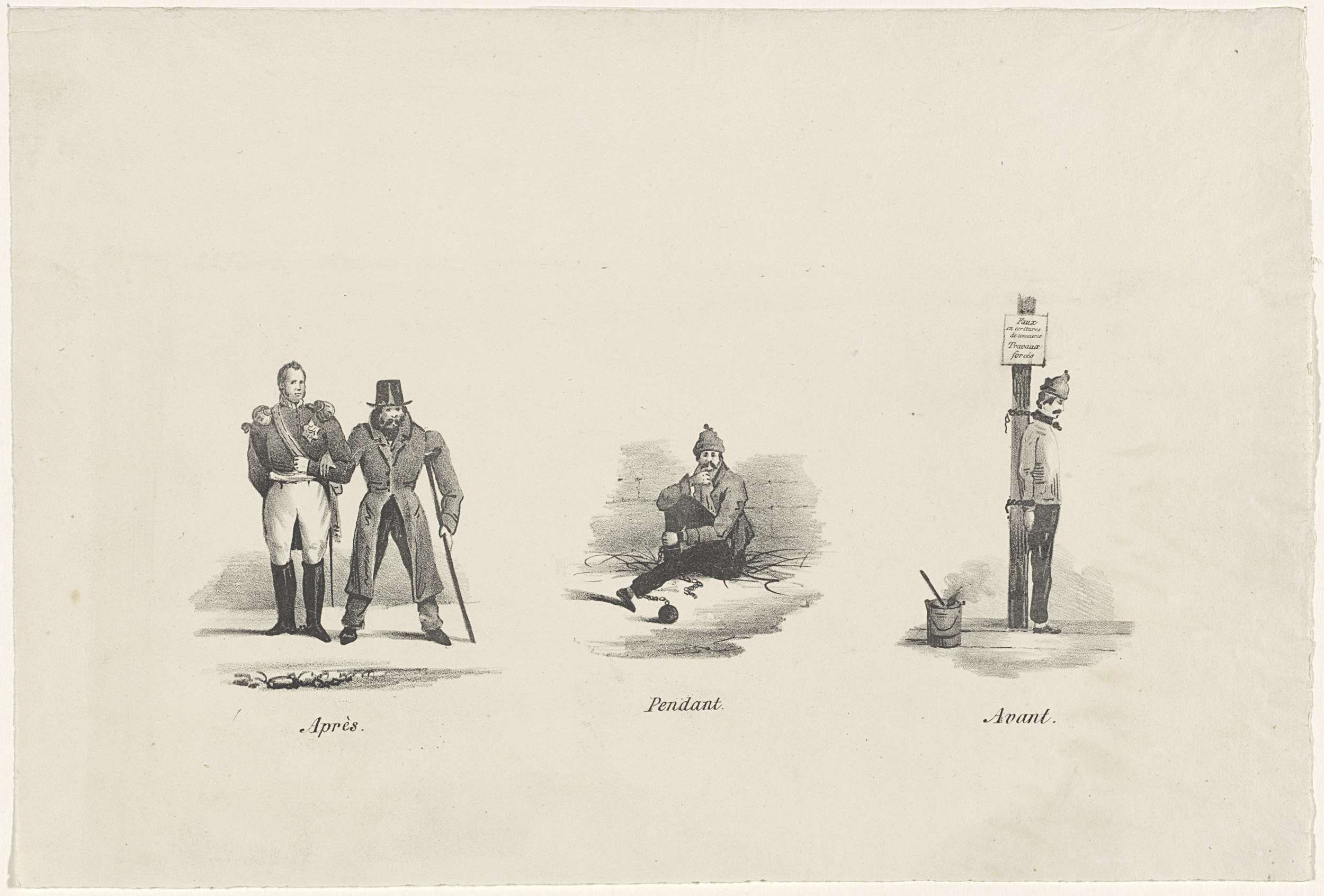 Spoprent op de uitgever George Libry, graaf van Bagnano, 1830. Rechts: in Frankrijk gebrandmerkt en ten toon gesteld aan een paal voor valsheid in geschrifte, midden: in de gevangenis met een kogelketting aan het been, links: als vriend van de Nederlandse koning Willem I.