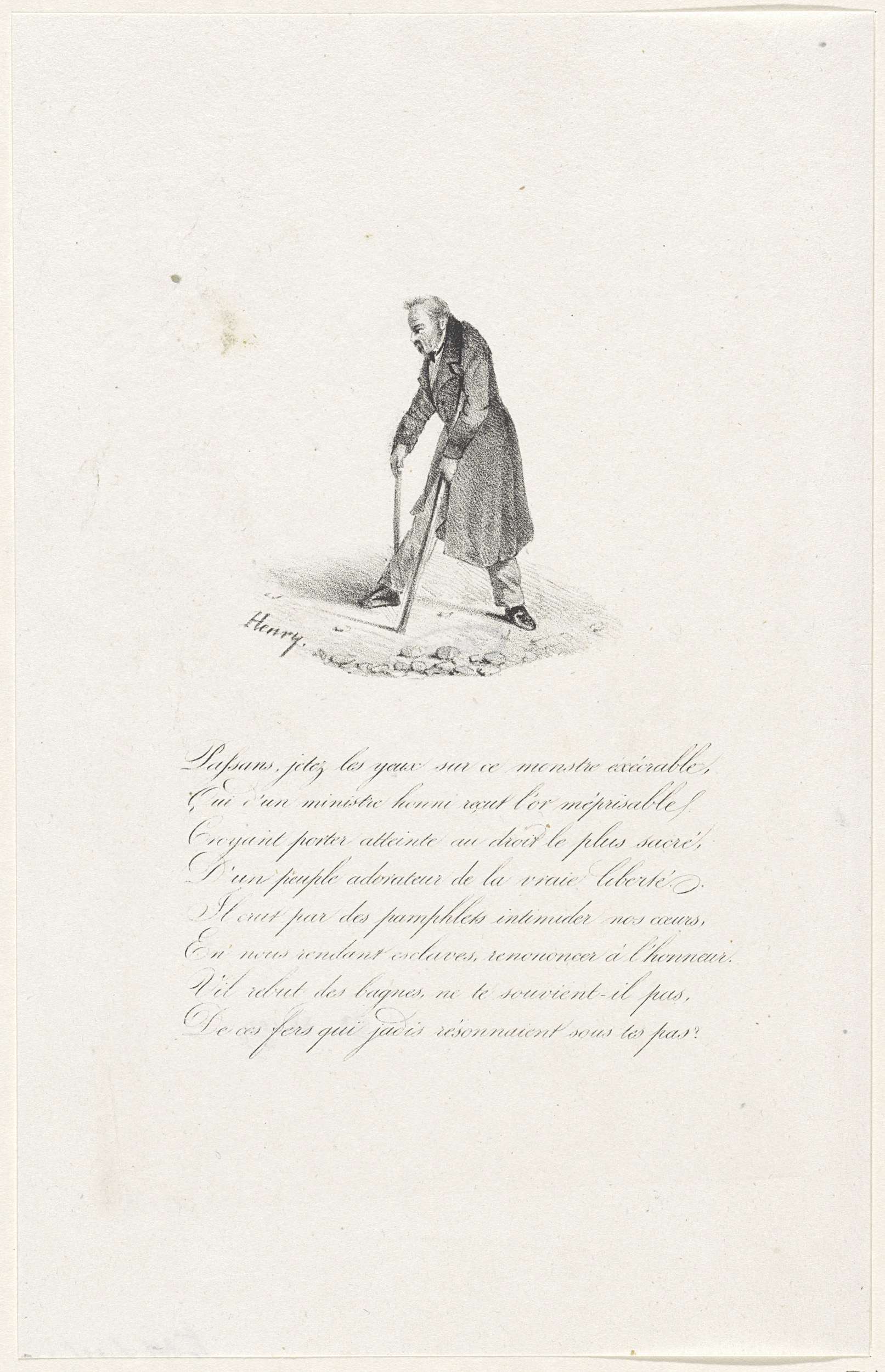 Spotprent op de pro-Nederlandse uitgever George Libry lopend met krukken, 1830. Met achtregelig onderschrift.