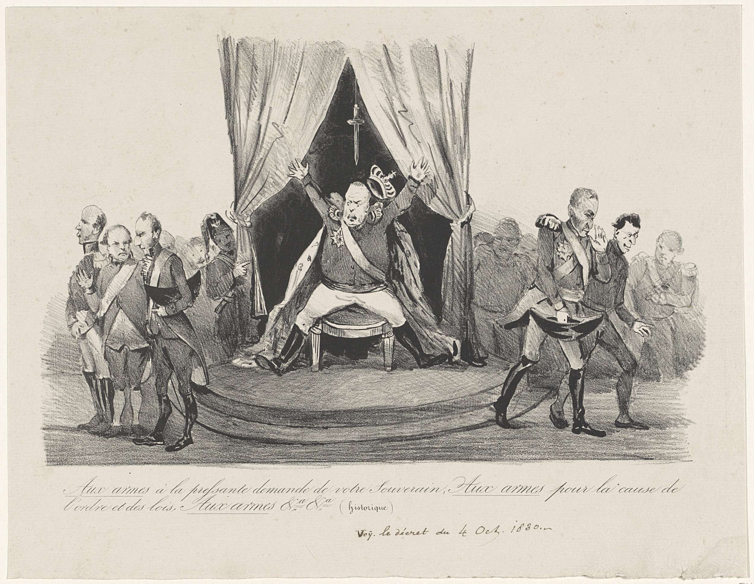 Spotprent op de oproep van koning Willem I tot vrijwillige wapening, 5 oktober 1830. De koning wanhopig op zijn troon waarboven het zwaard van Damocles hangt. Links en rechts lopen minsters weg of keren de koning de rug toe.