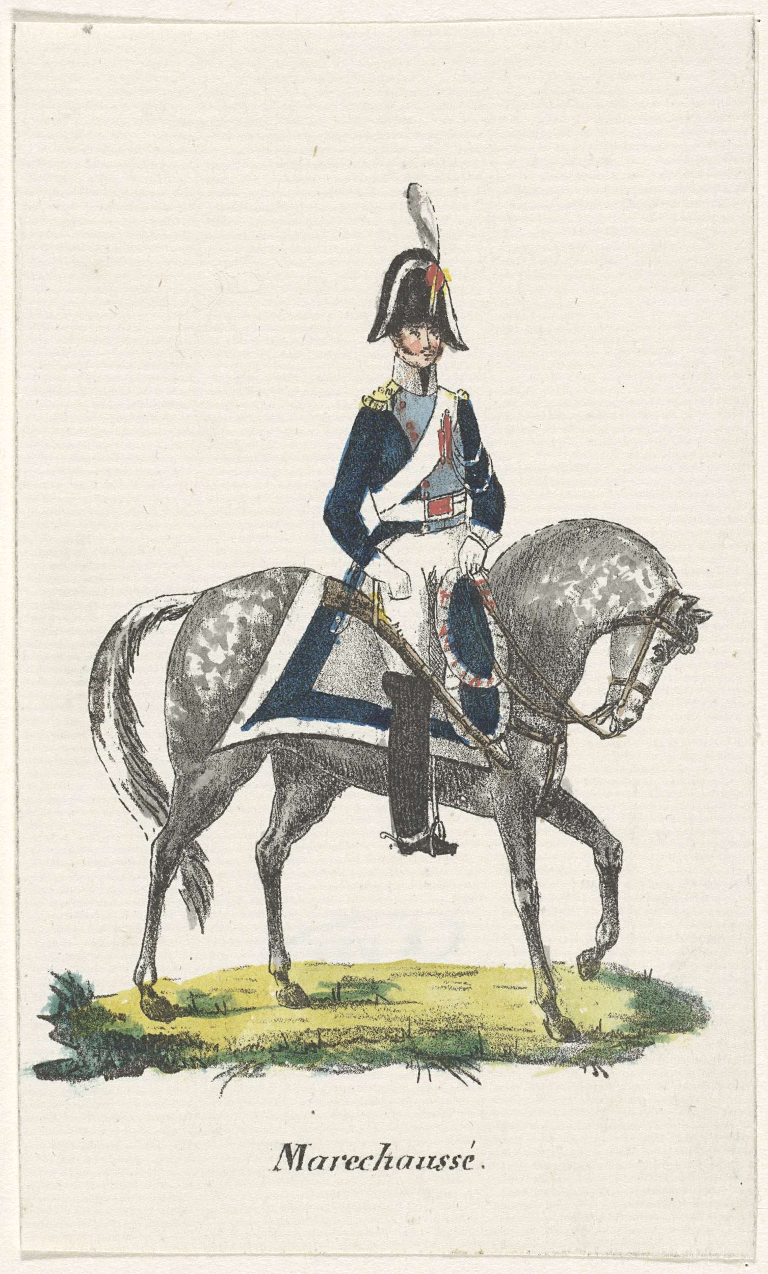Uniform van een marechaussee te paard. Onderdeel van een serie van 21 kleine prenten van uniformen van het Nederlandse leger (Koninklijke Nederlandsche Armée) ca. 1830.