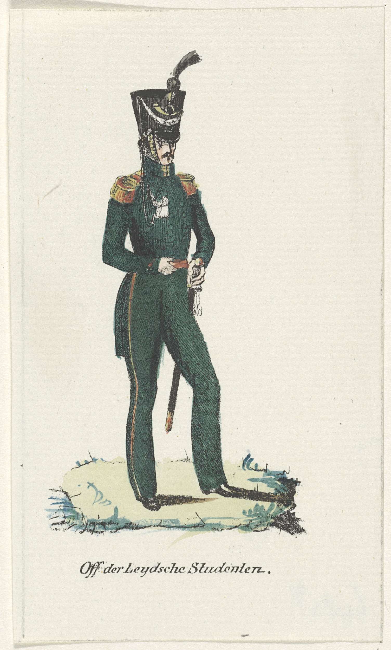 Uniform van een officier van de compagnie Vrijwillige Jagers der Leidse Hogeschool. Onderdeel van een serie van 21 kleine prenten van uniformen van het Nederlandse leger (Koninklijke Nederlandsche Armée) ca. 1830.
