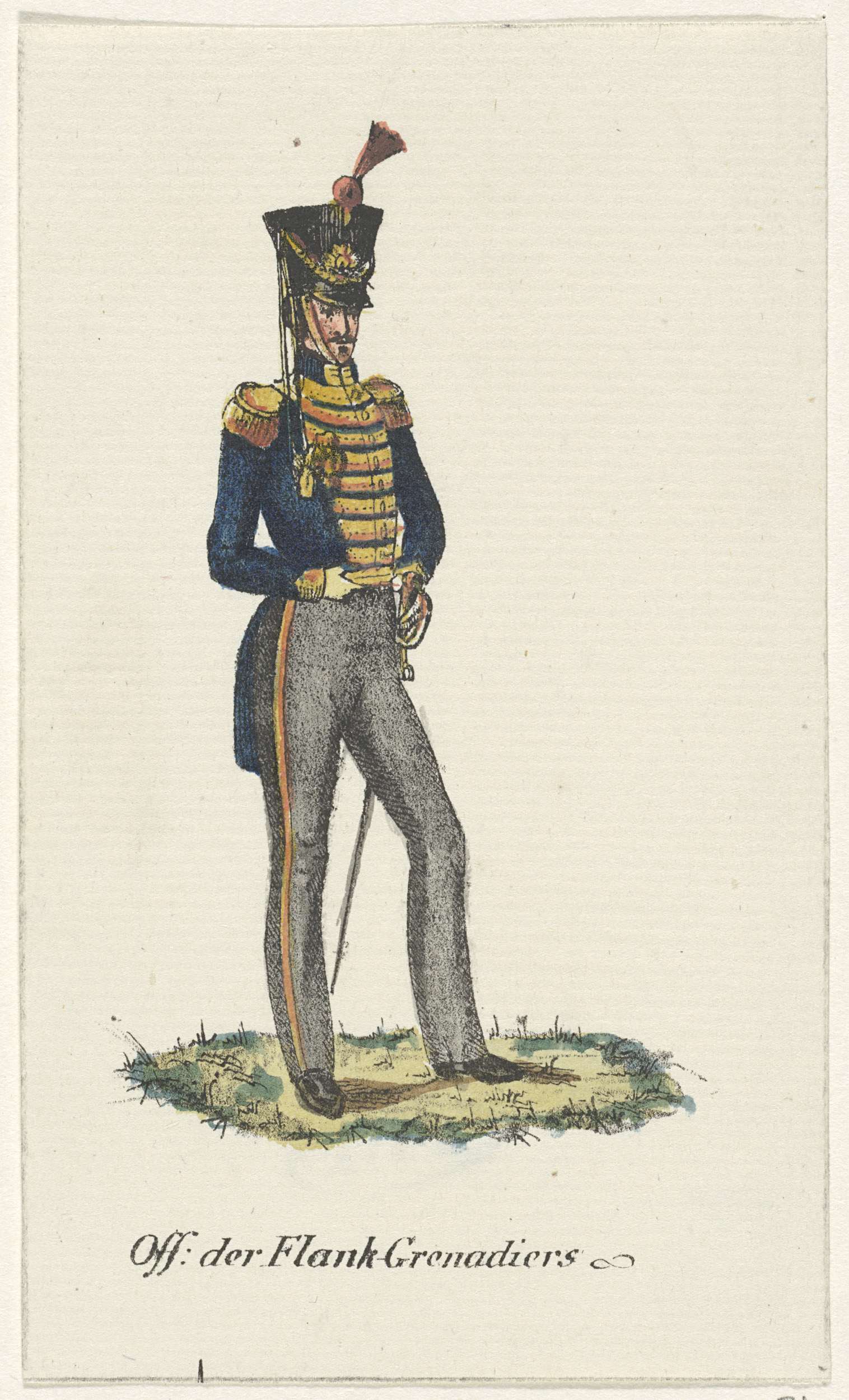 Uniform van een officier van de flank grenadiers. Onderdeel van een serie van 21 kleine prenten van uniformen van het Nederlandse leger (Koninklijke Nederlandsche Armée) ca. 1830.