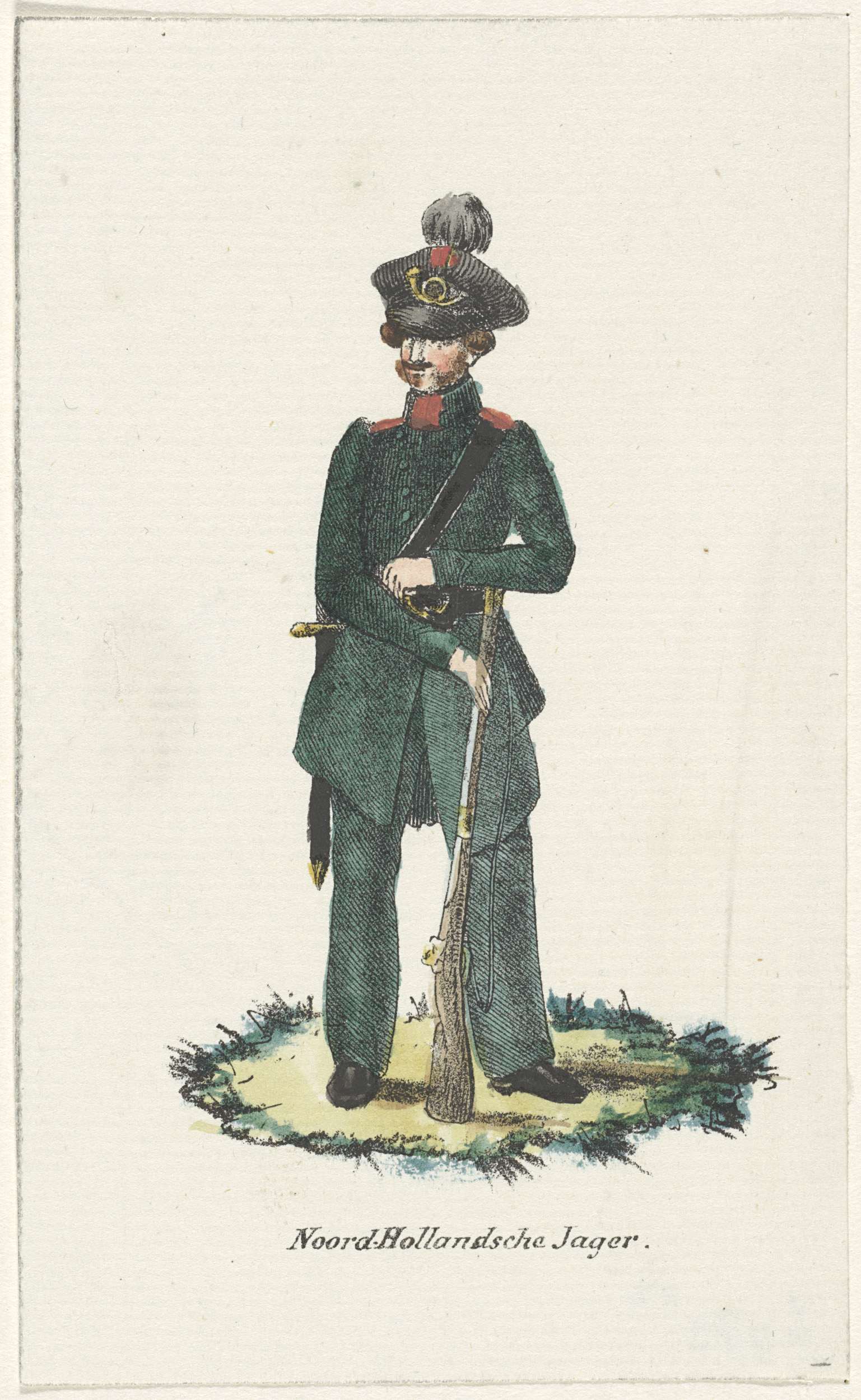 Uniform van een Vrijwillige Jagers van Noord-Holland. Onderdeel van een serie van 21 kleine prenten van uniformen van het Nederlandse leger (Koninklijke Nederlandsche Armée) ca. 1830.