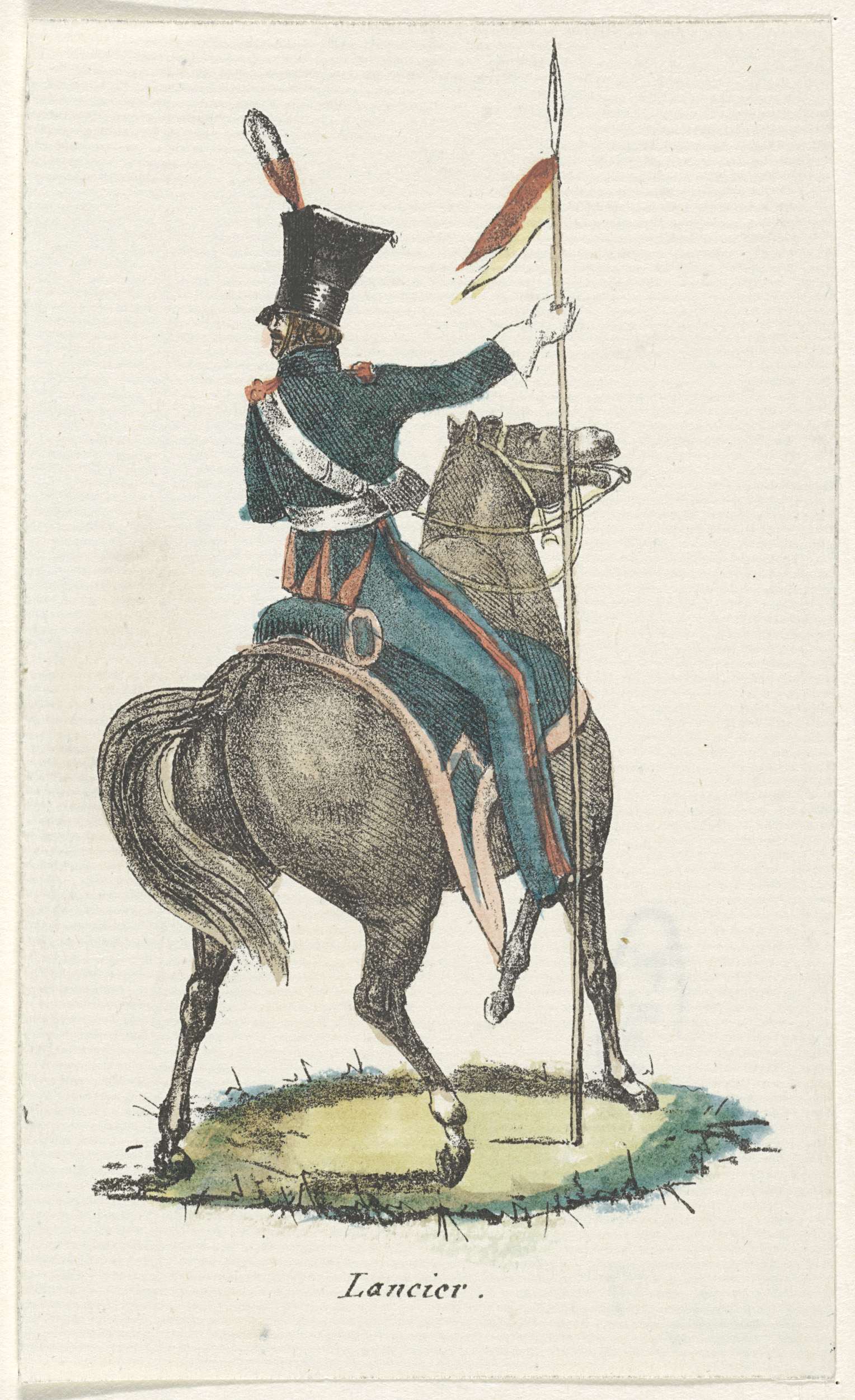 Uniform van een lansier. Onderdeel van een serie van 21 kleine prenten van uniformen van het Nederlandse leger (Koninklijke Nederlandsche Armée) ca. 1830.