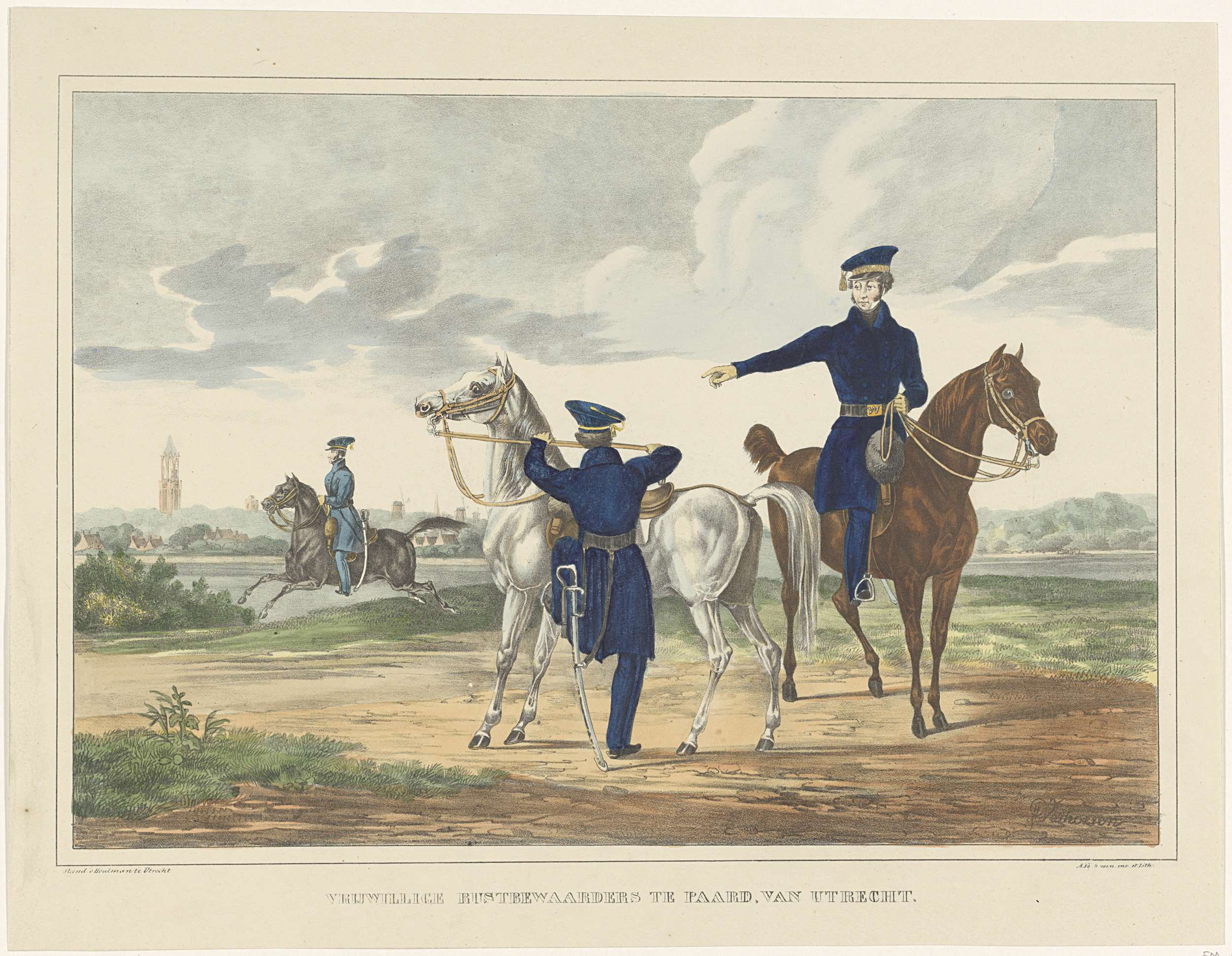 Uniformen van drie leden van de Vrijwillige Rustbewaarders te Paard, van Utrecht, 1830. Voor een landschap met in de verte de Dom van Utrecht. Zie ook de pendant.
