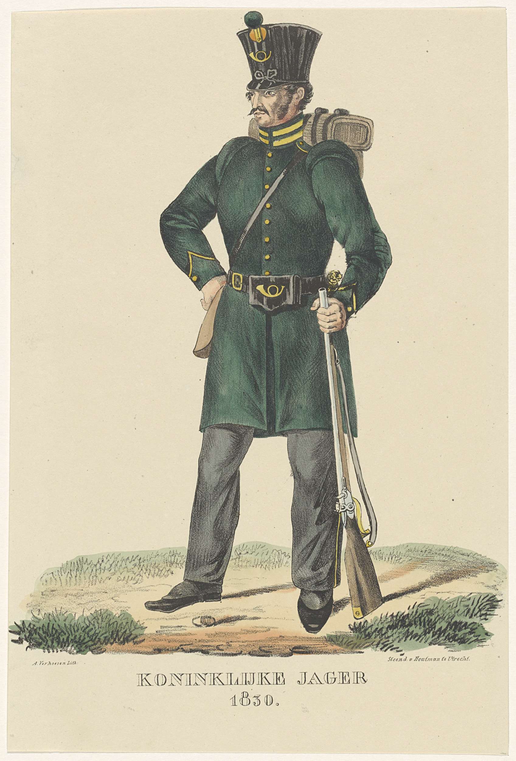 Uniform van een Koninklijke Jager, 1830. Staande, het geweer rustend op de grond.
