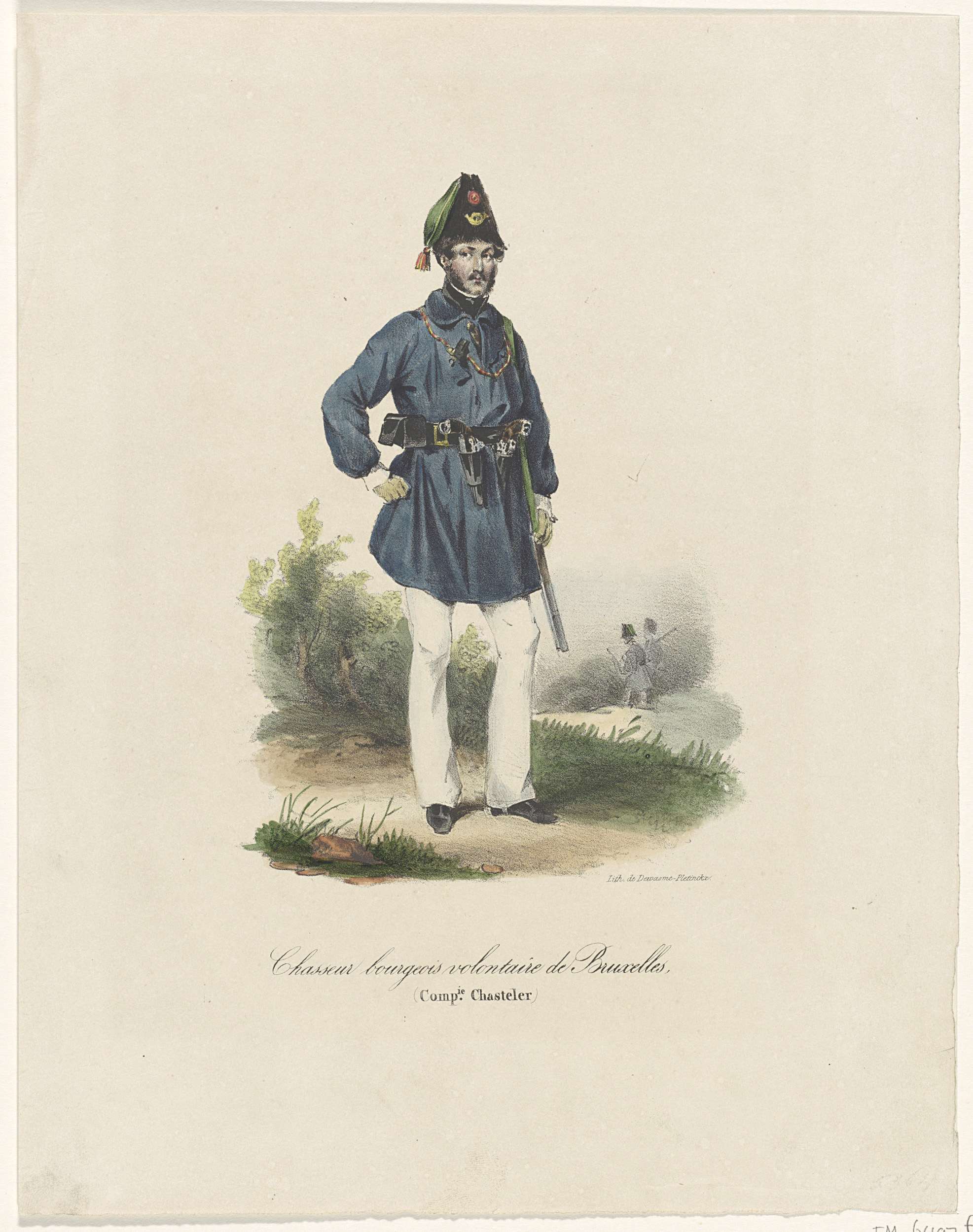Een Belgische jager, van de Chasseurs du Marquis de Chasteler, een compagnie vrijwilligers jagers samengesteld uit burgers van Brussels, opgericht in 1830. Onderdeel van een groep voorstellingen van Belgische uniformen.