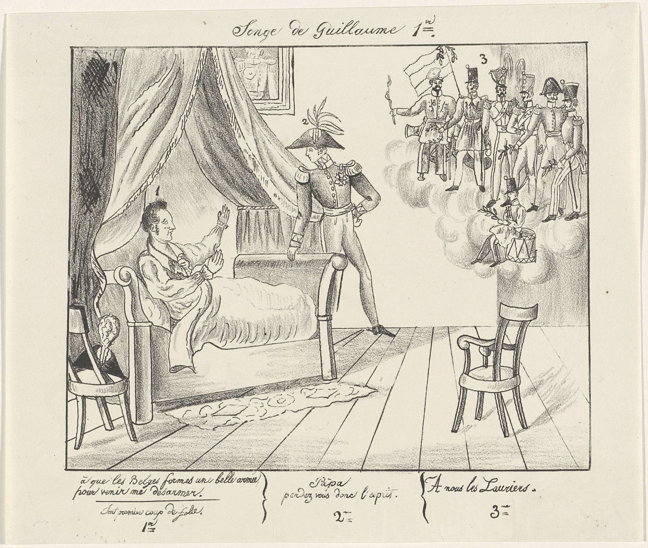 Koning Willem I ziet in zijn droom zeven fraai uitgedoste militairen van het Belgische leger, met lauwertakken beloond, 1830. Naast het bed van zijn vader staat de kroonprins . Met onderschrift 1-3.