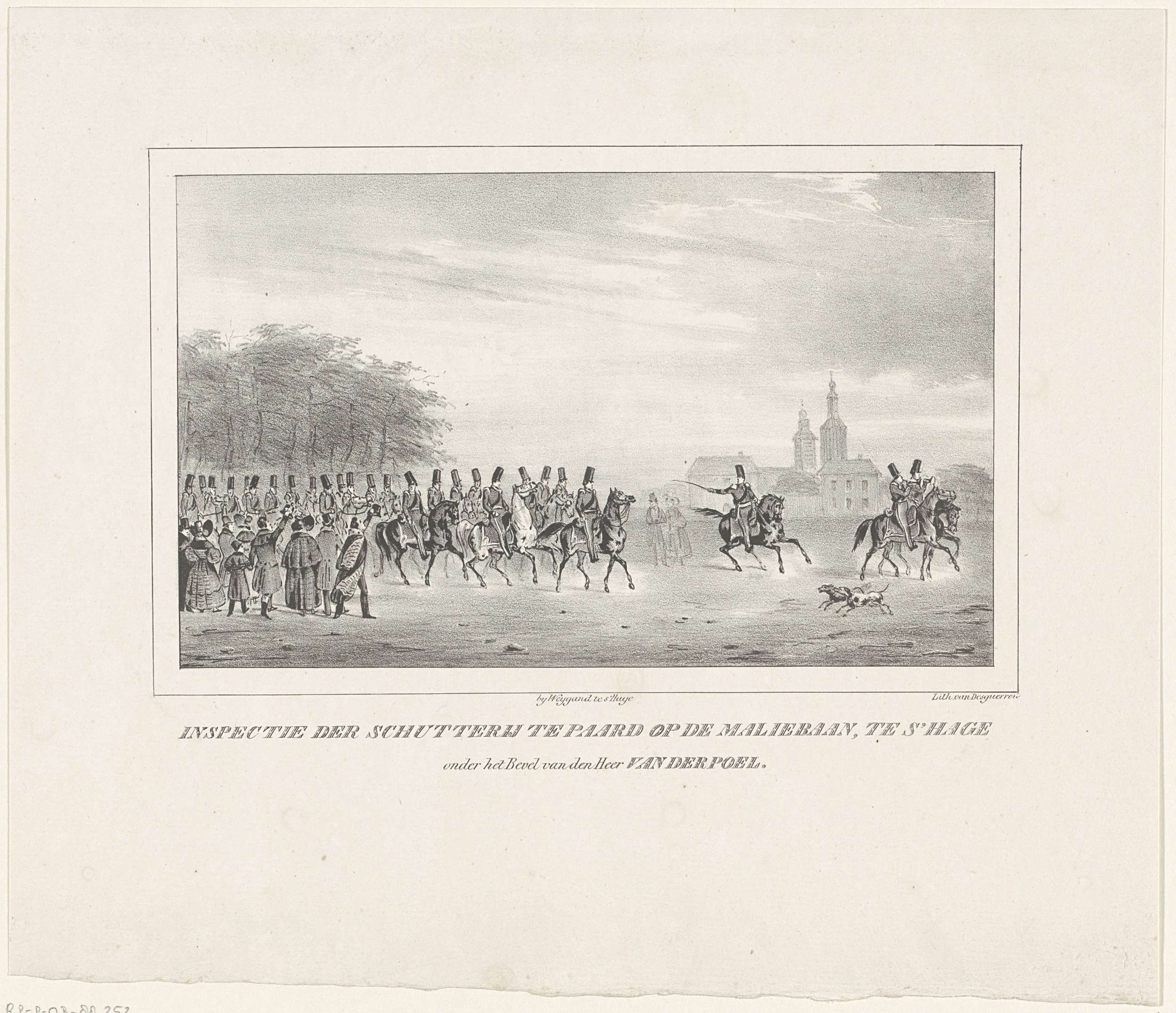 Inspectie van de vrijwillige Haagsche Schutterij te paard, onder bevel van de officier Van der Poel, op de Maliebaan te Den Haag, 15-16 oktober 1830. Zie ook de pendant.
