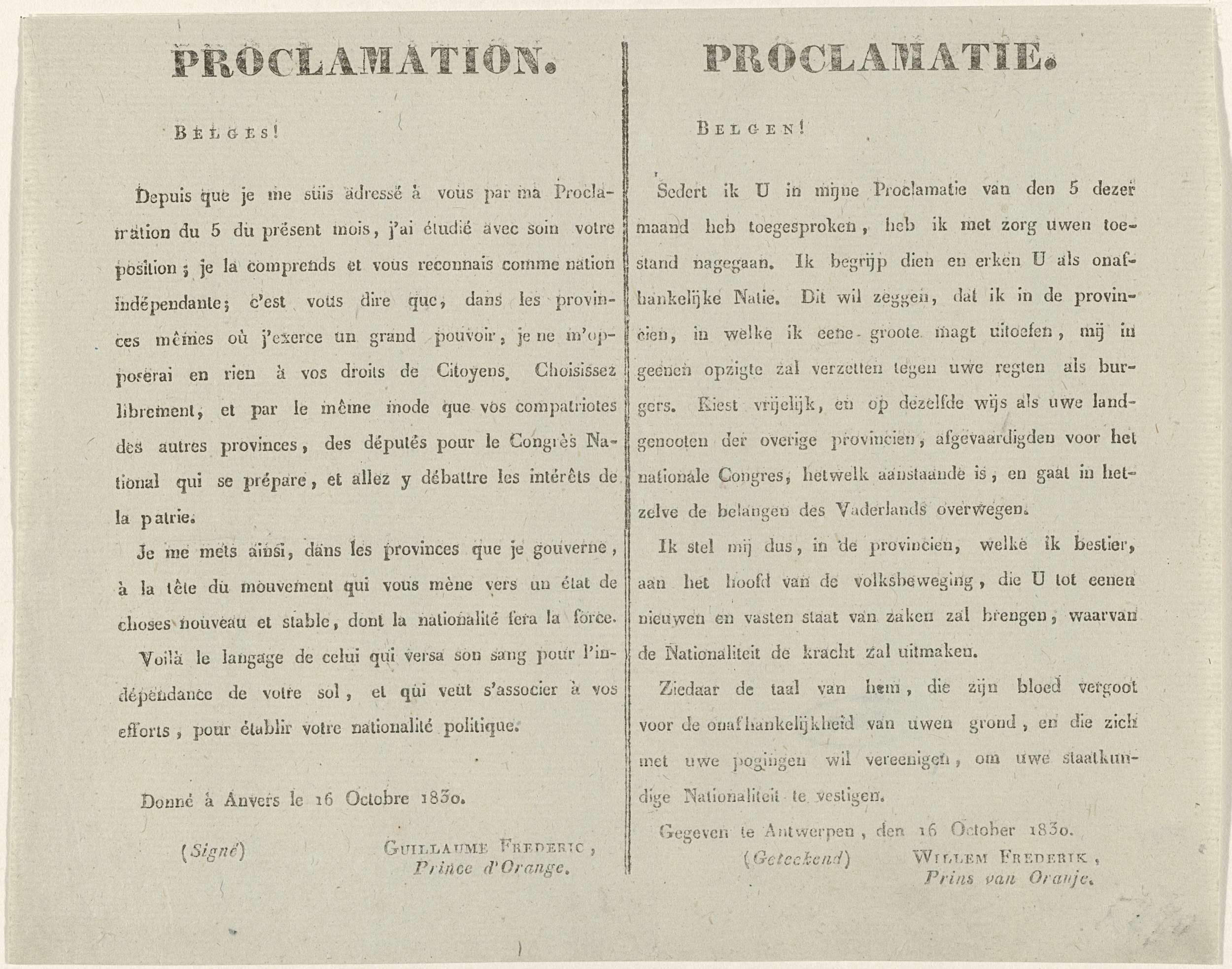 Proclamatie van de prins van Oranje vanuit Antwerpen, waarin hij de wens van de Belgen om een onafhankelijke staat erkent, 16 oktober 1830. Tekst in het Frans en het Nederlands, in twee kolommen naast elkaar.