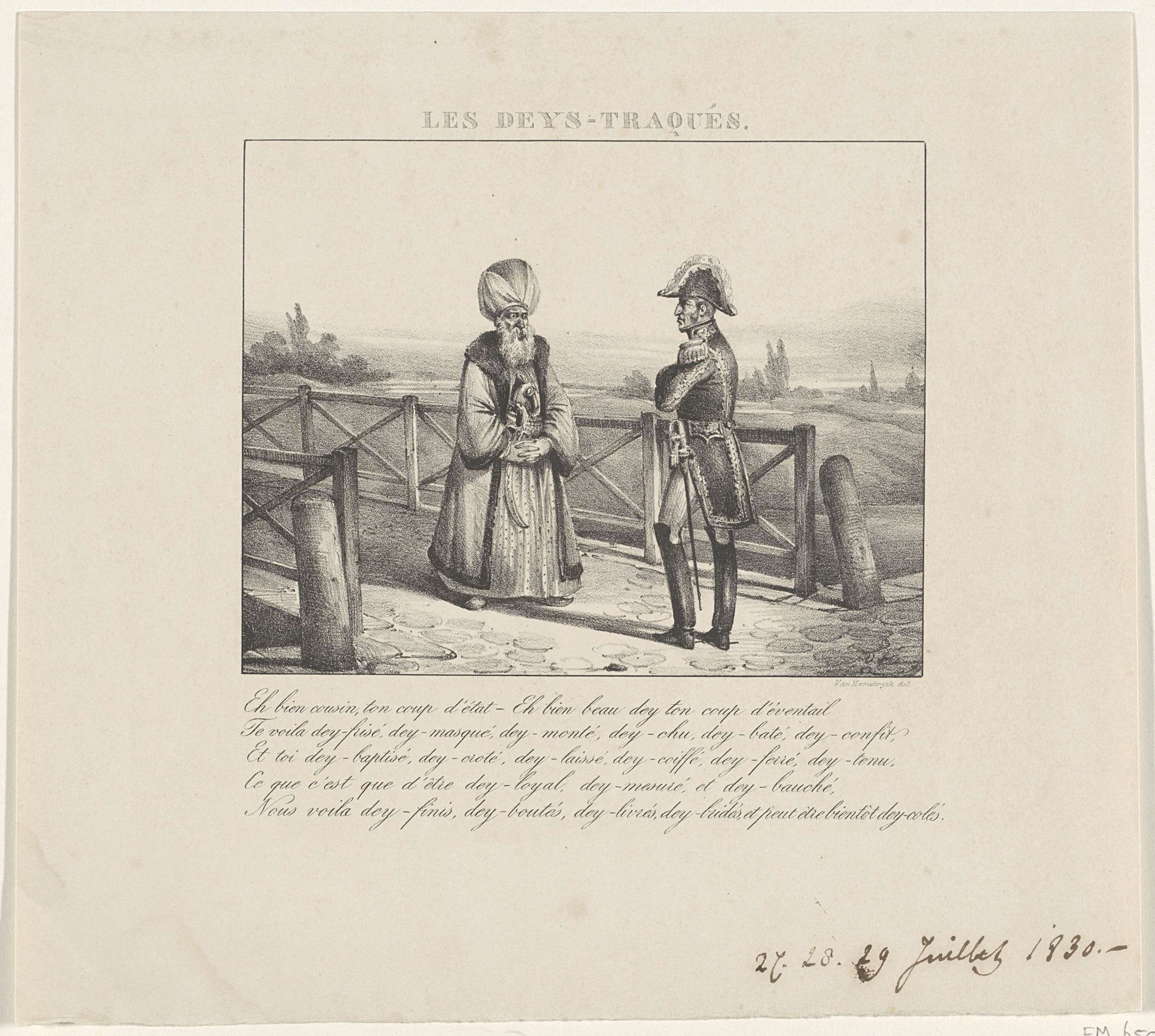 Spotprent op de pogingen van koning Willem I om België met geweld te behouden, 1830. Willem I en de Hussein Dey van Algiers (baard, grote tulband, priemende ogen), als twee afgezette tirannen, ontmoeten elkaar op een brug. Met vijfregelig onderschrift.