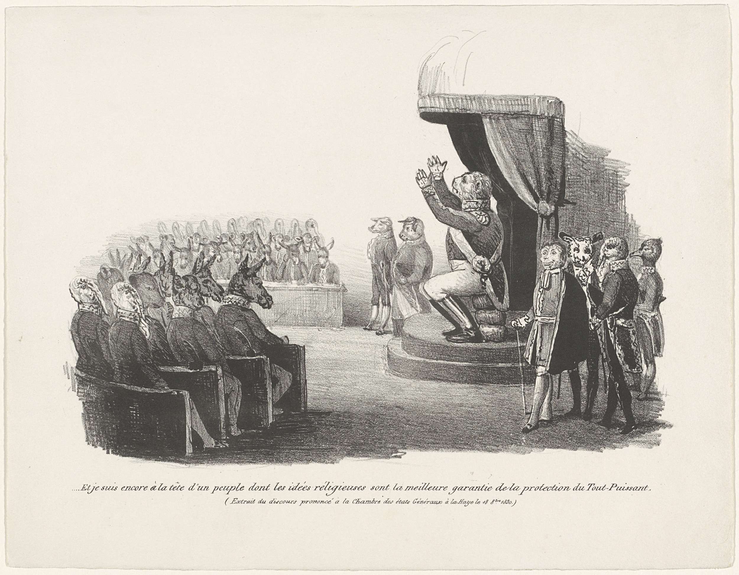 Spotprent waarin koning Willem I met de troonrede de zitting van de Staten-Generaal in Den Haag op 18 oktober 1830 opent. De koning voorgesteld als een leeuw zittend op een troon van opgestapelde ronde kazen en heft zijn handen ten hemel. De ministers staande naast de troon ook als dieren, de leden van het parlement ...