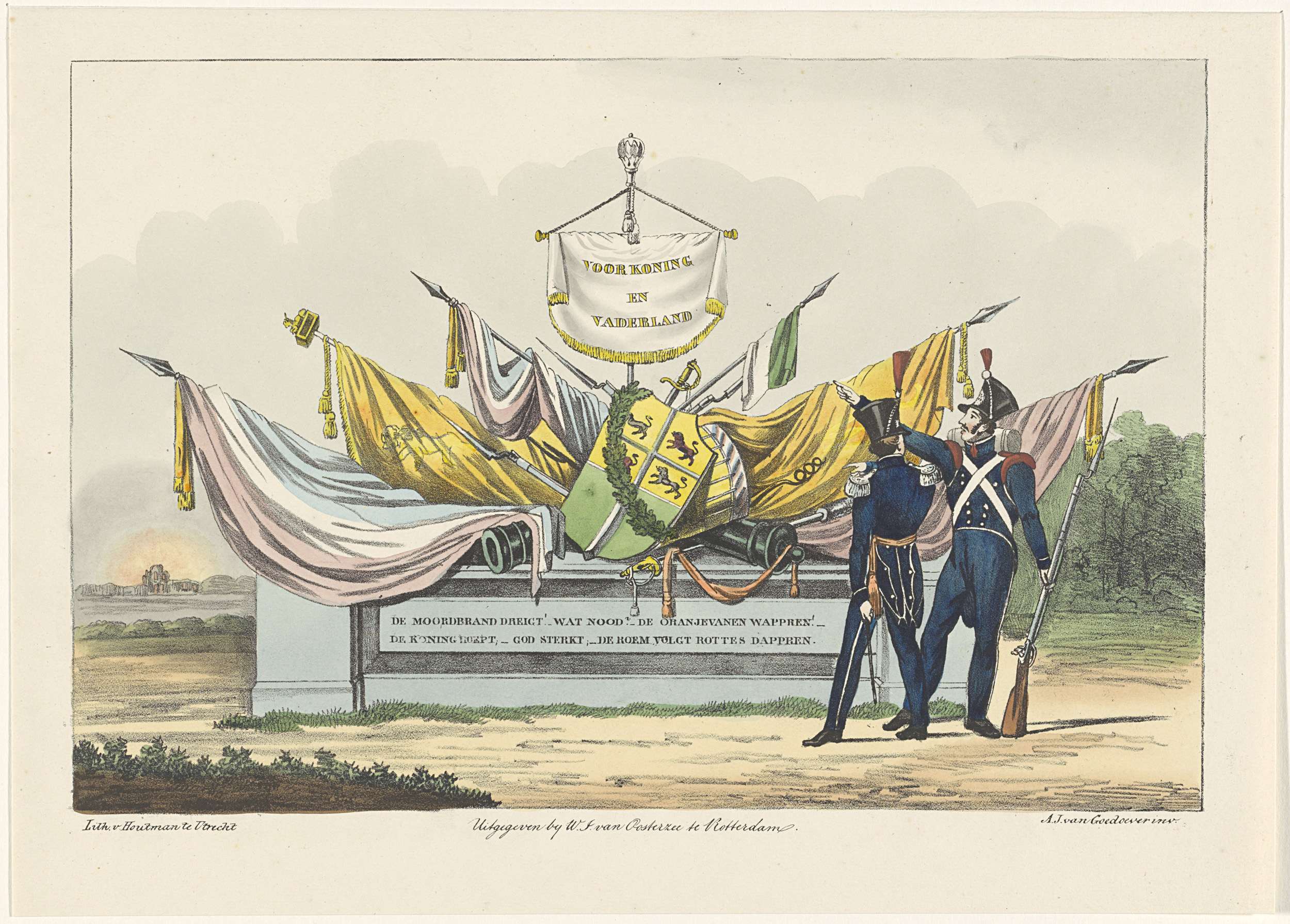 Allegorie op het uittrekken van de vrijwillige Rotterdamse schutterij, 20 oktober 1830. Twee militairen voor een monument met een wapentrofee van vaandels en vlaggen, kanonnen en een banier met opschrift 'Voor Koning en Vaderland'. Op het monument een tweeregelig opschrift. In de verte een brandende stad.
