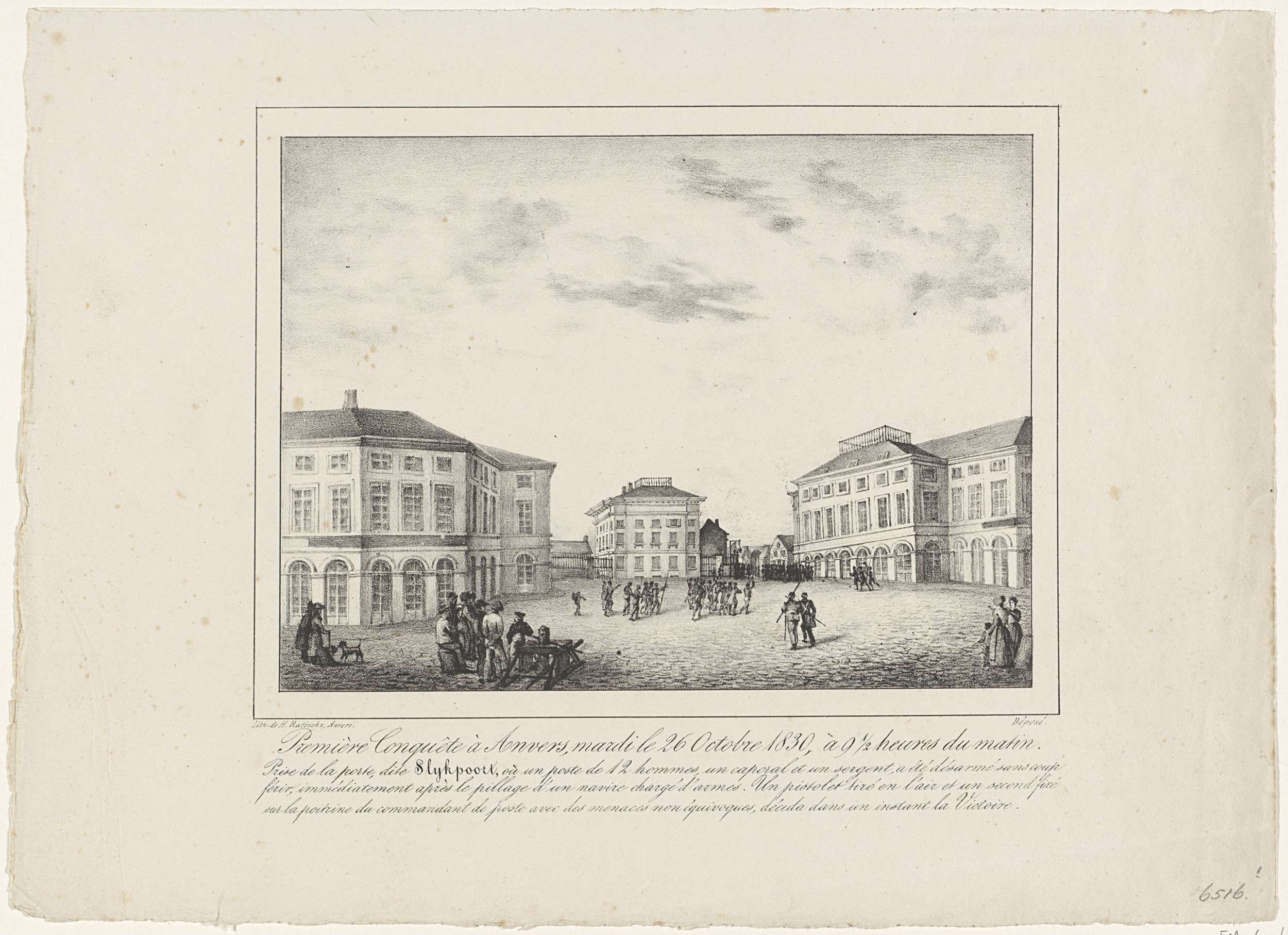 De eerste overwinning van de opstandelingen in Antwerpen, de verovering van de Slijkpoort op 26 oktober 1830. Met vierregelig onderschrift. Onderdeel van een serie van negentien platen van de gevechten in Antwerpen, 26-27 oktober 1830.