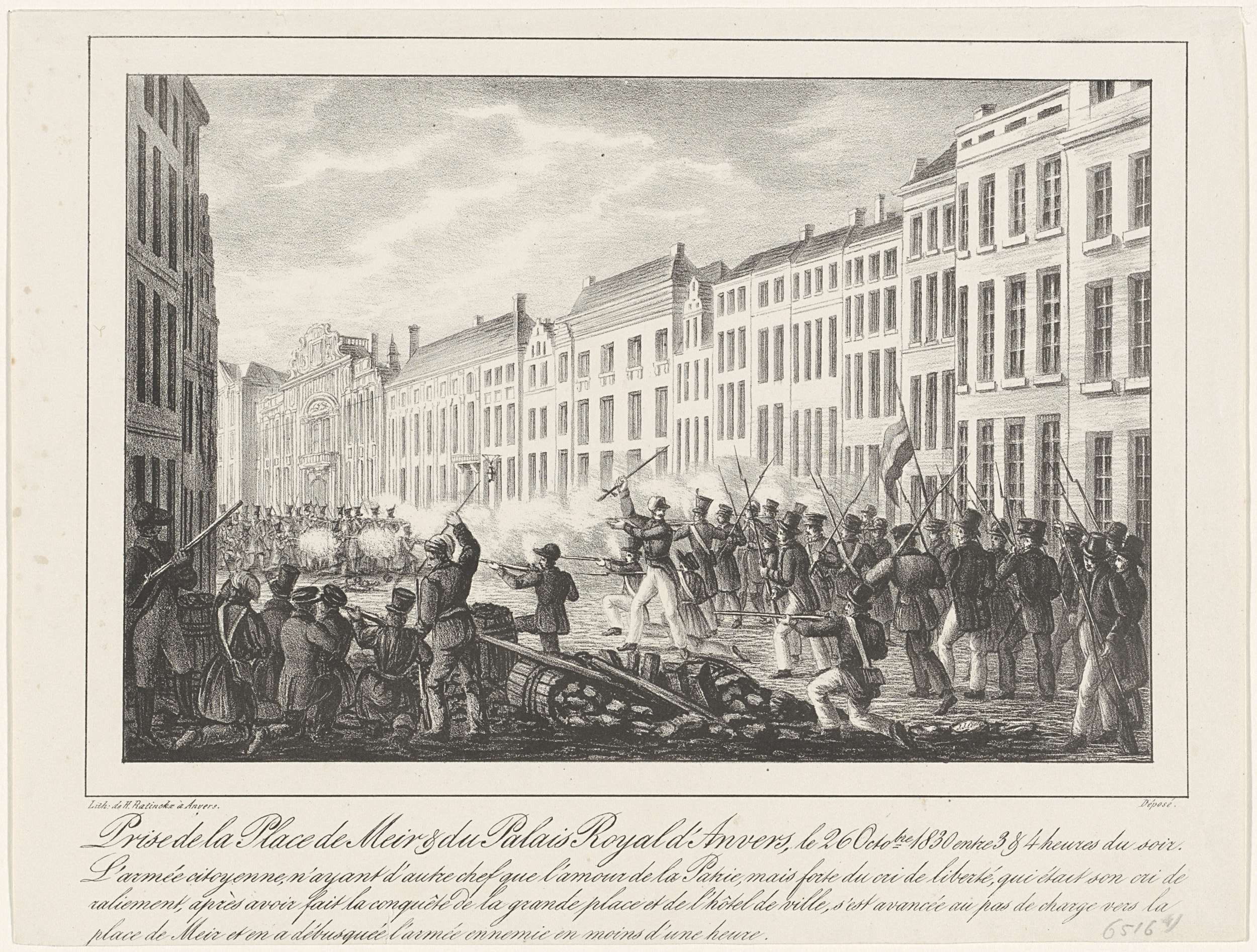 Verovering door de opstandelingen van de Meir en het Koninklijk Paleis op de Meir te Antwerpen op 26 oktober 1830. Op de voorgrond de opstandelingen achter een barricade, schietend op de Hollandse troepen. Met vierregelig onderschrift. Onderdeel van een serie van negentien platen van de gevechten in Antwerpen, 26-27 oktober 1830.