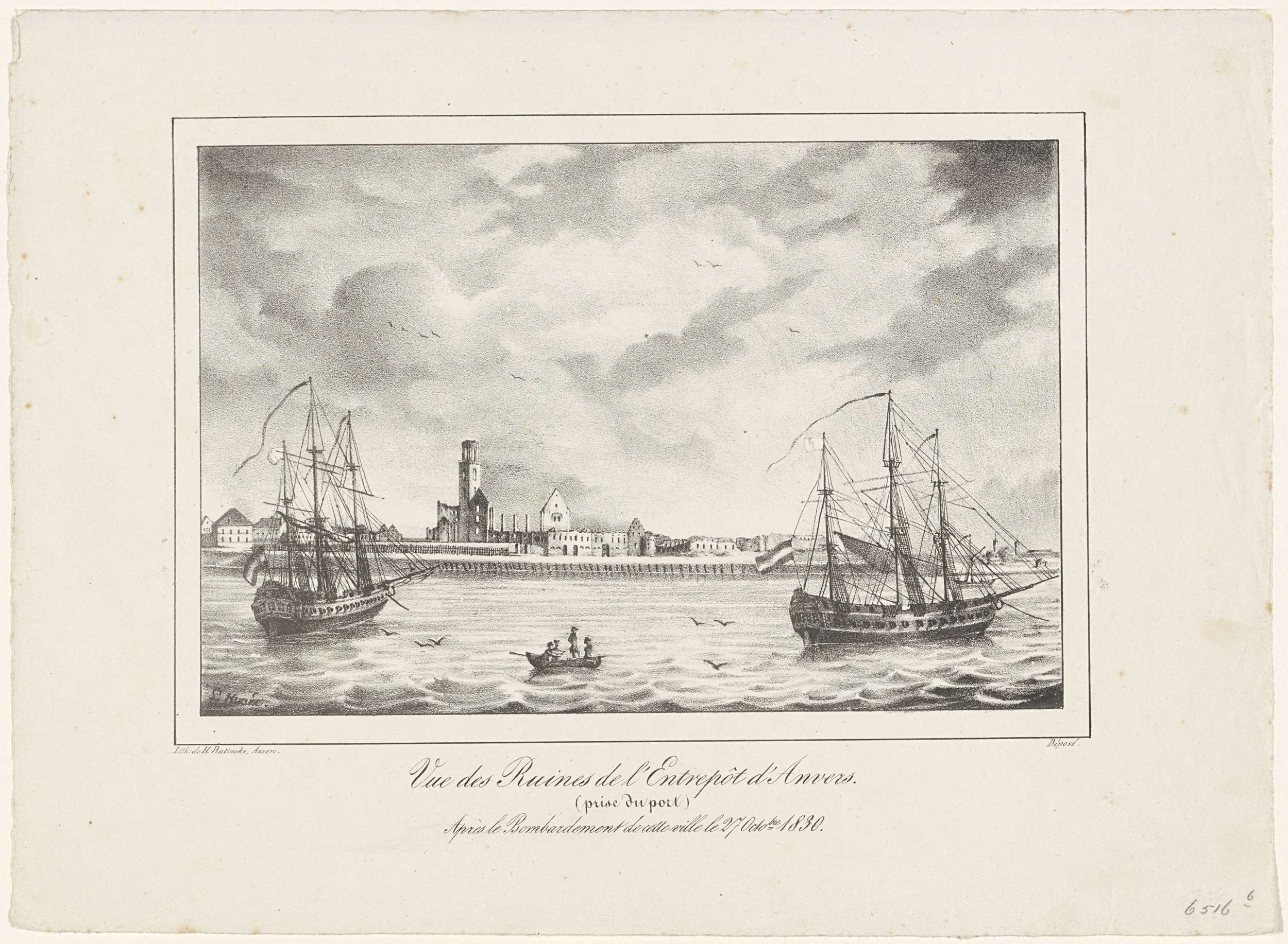 Ruïnes van het entrepot in Antwerpen na het bombardement van 27 oktober 1830. Met drieregelig onderschrift. Onderdeel van een serie van negentien platen van de gevechten in Antwerpen, 26-27 oktober 1830.