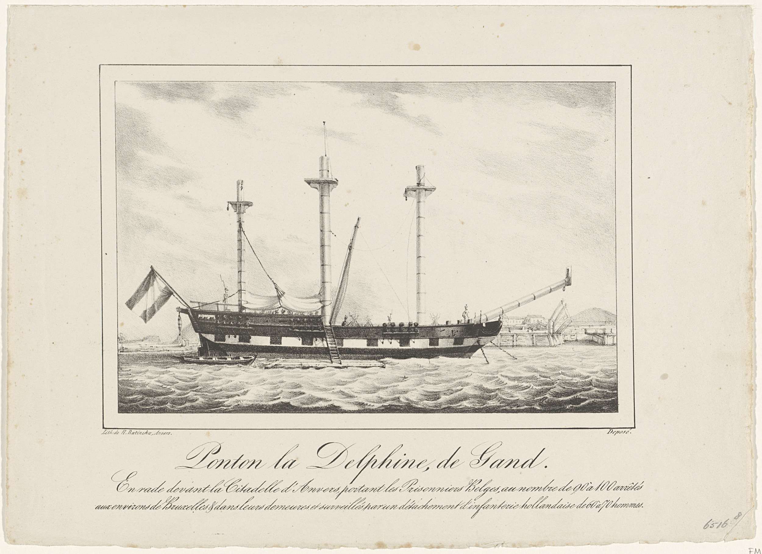 Het schip La Delphine (mogelijk La Dauphine) uit Gent gebruikt als een Nederlands gevangenisschip waarin ca. 99-100 Belgische gevangenen opgesloten waren. Voor anker liggend aan de rede bij de Citadel van Antwerpen, (oktober?) 1830. Met drieregelig onderschrift. Onderdeel van een serie van negentien platen van de gevechten in Antwerpen, 26-27 oktober 1830.