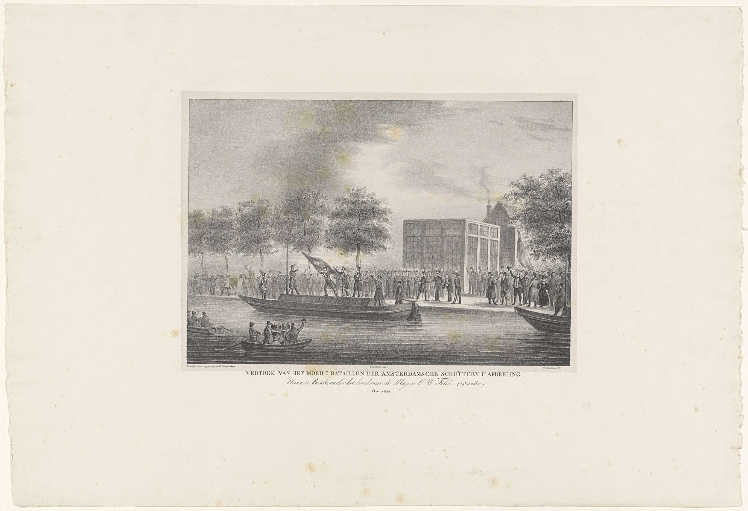 Vertrek van het Mobiele Bataljon van de vrijwillige Amsterdamse schutterij, eerste afdeling, onder commando van majoor Otto Willem Falck, naar Den Bosch op 29 oktober 1830. Inscheping in de trekschuit op de Amstel, rechts de herberg de Berebijt waar een muziekkorps speelt en publiek staat.