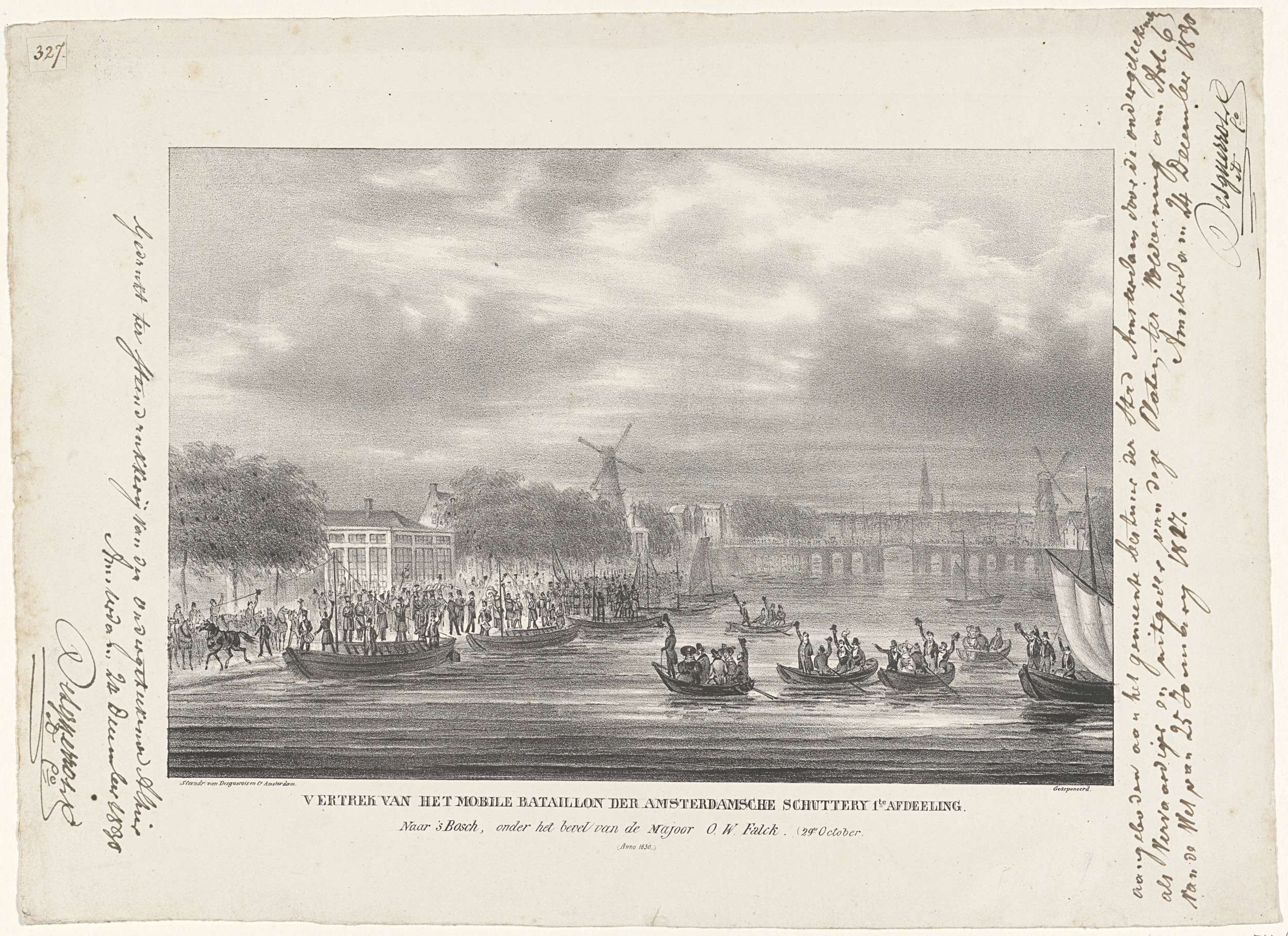 Vertrek van het Mobiele Bataljon van de vrijwillige Amsterdamse schutterij, eerste afdeling, onder commando van majoor Otto Willem Falck, naar Den Bosch op 29 oktober 1830. Inscheping in de trekschuiten op de Amstel voor de herberg de Berebijt. Rechts meerdere kleine bootjes op de Amstel, in de verte een brug, molens en torens van de ...