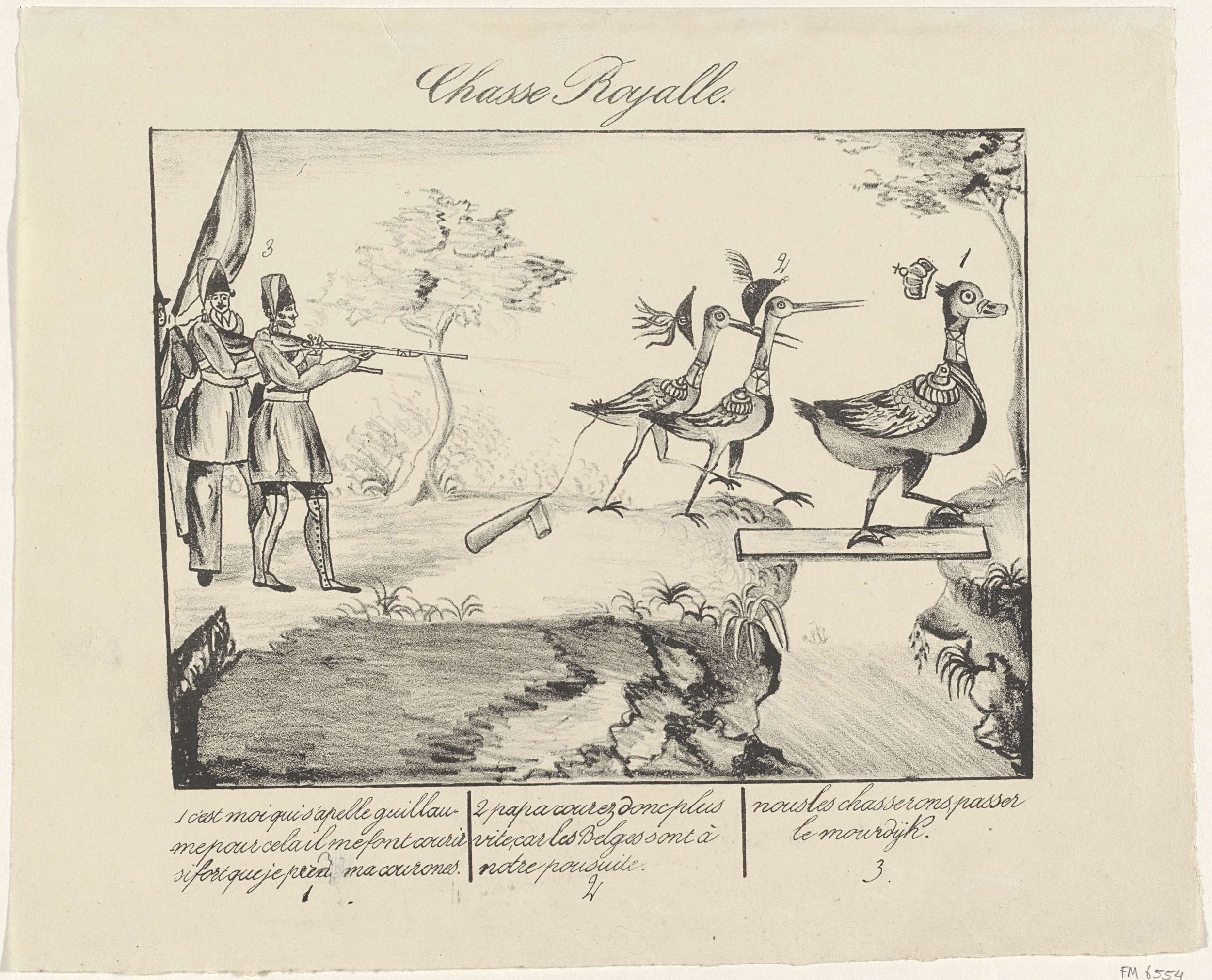 Spotprent op de terugtrekking van de Nederlandse troepen uit België, 21 november 1830. Een eend met kroon (Willem I) en twee ooievaars (de kroonprins en prins Frederik) worden door schietende Belgische opstandelingen over een brug over de Moerdijk terug naar Nederland verjaagd. Met onderschriften 1-3.