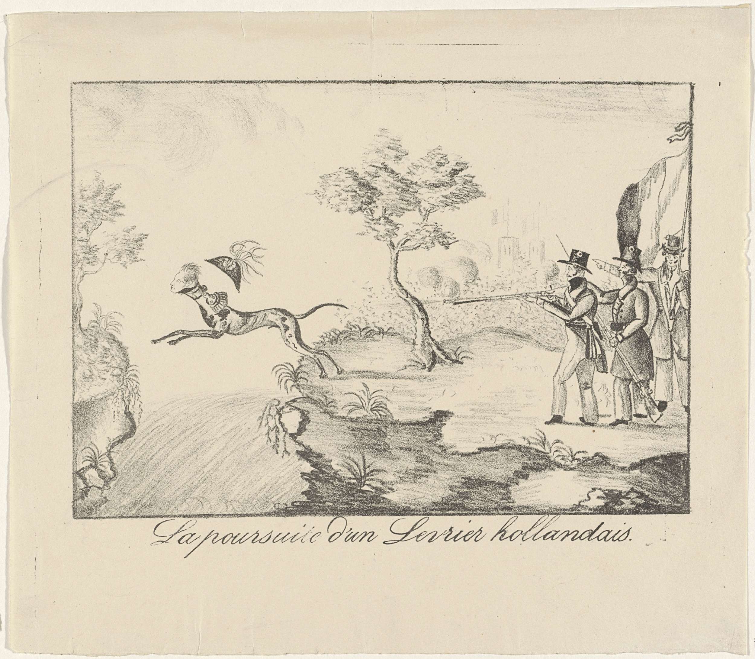 Spotprent op de terugtrekking van de Nederlandse troepen uit België, november 1830. Een hazewindhond (prins Frederik) wordt door schietende Belgische opstandelingen over een rivier terug naar Nederland verjaagd.