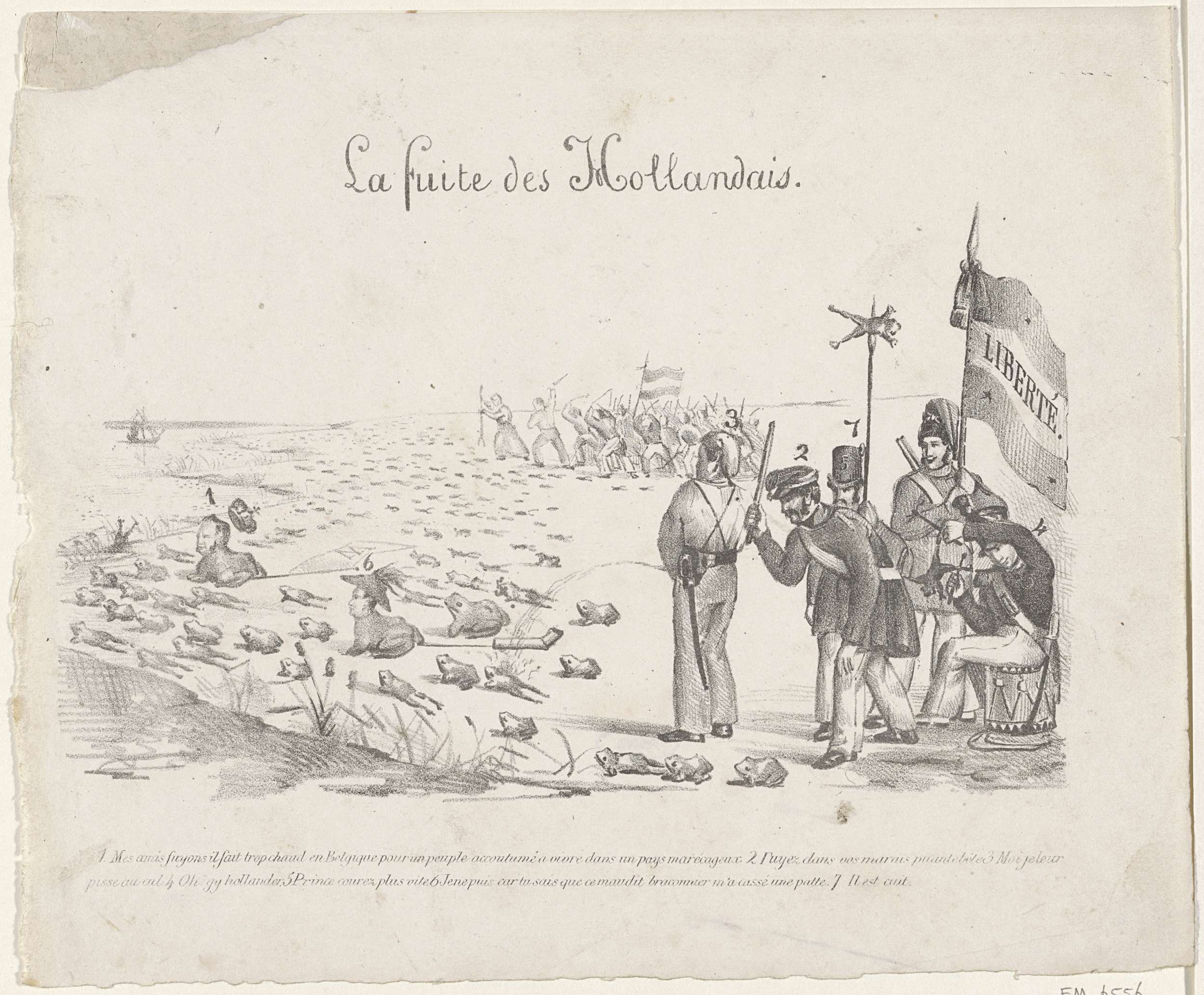 Spotprent op de terugtrekking van de Nederlandse troepen uit België, november 1830. Belgische opstandelingen met de vlag 'Liberté' verjagen een groep kikkers van het land in het water. Onder de kikkers bevinden zich koning Willem I en prins Frederik. Een opstandeling pist op een kikker, van een andere kikker worden de poten afgesneden en een ...