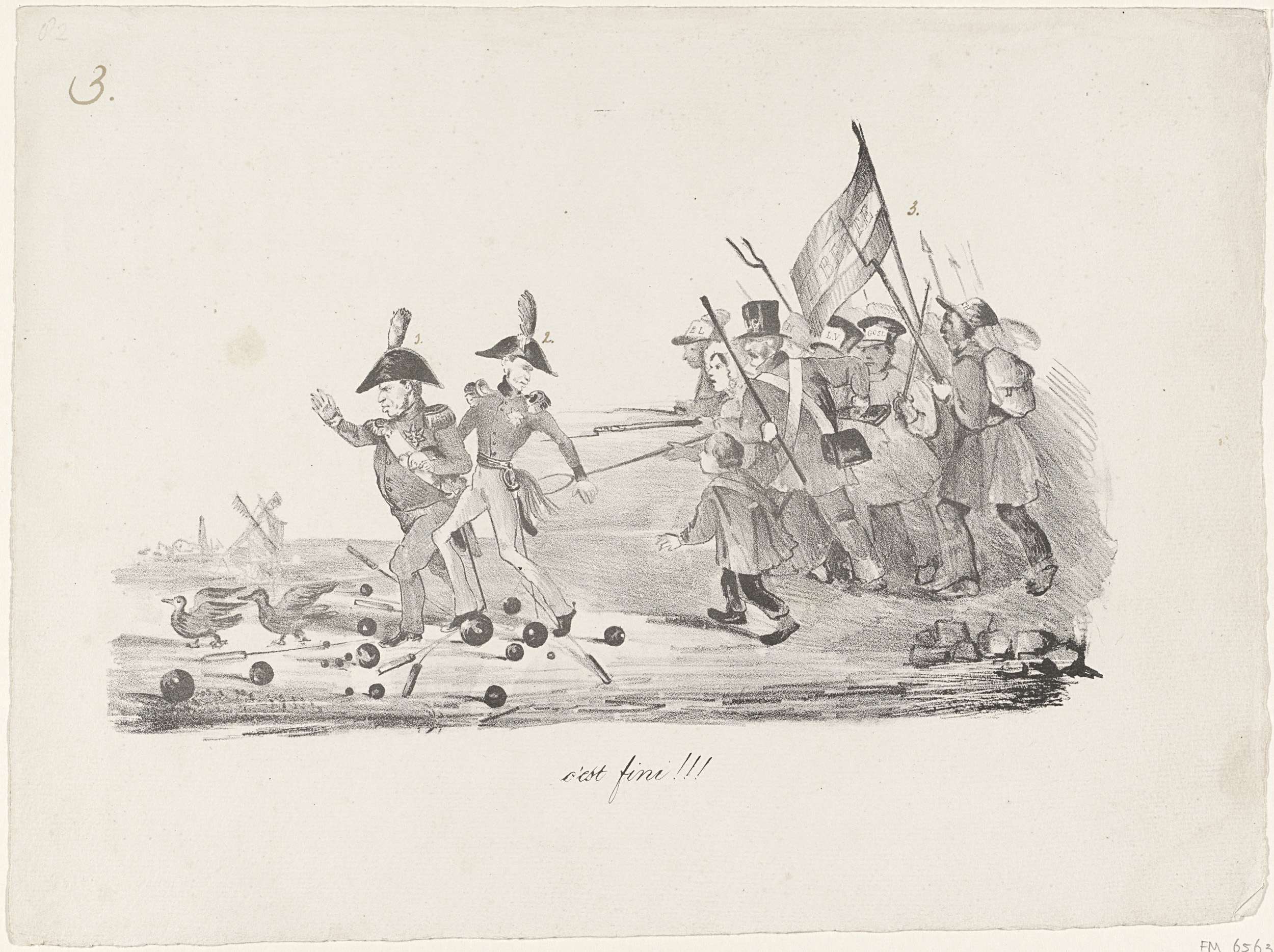 Spotprent op de vervallenverklaring van het Huis van Oranje-Nassau van de Belgische troon door het Belgische Congres, 23 november 1830. Een groep Belgische opstandelingen verjaagt koning Willem I en prins Frederik uit het land. Op de grond tussen de voeten van de Nederlanders liggen kanonskogels en vuurpijlen.