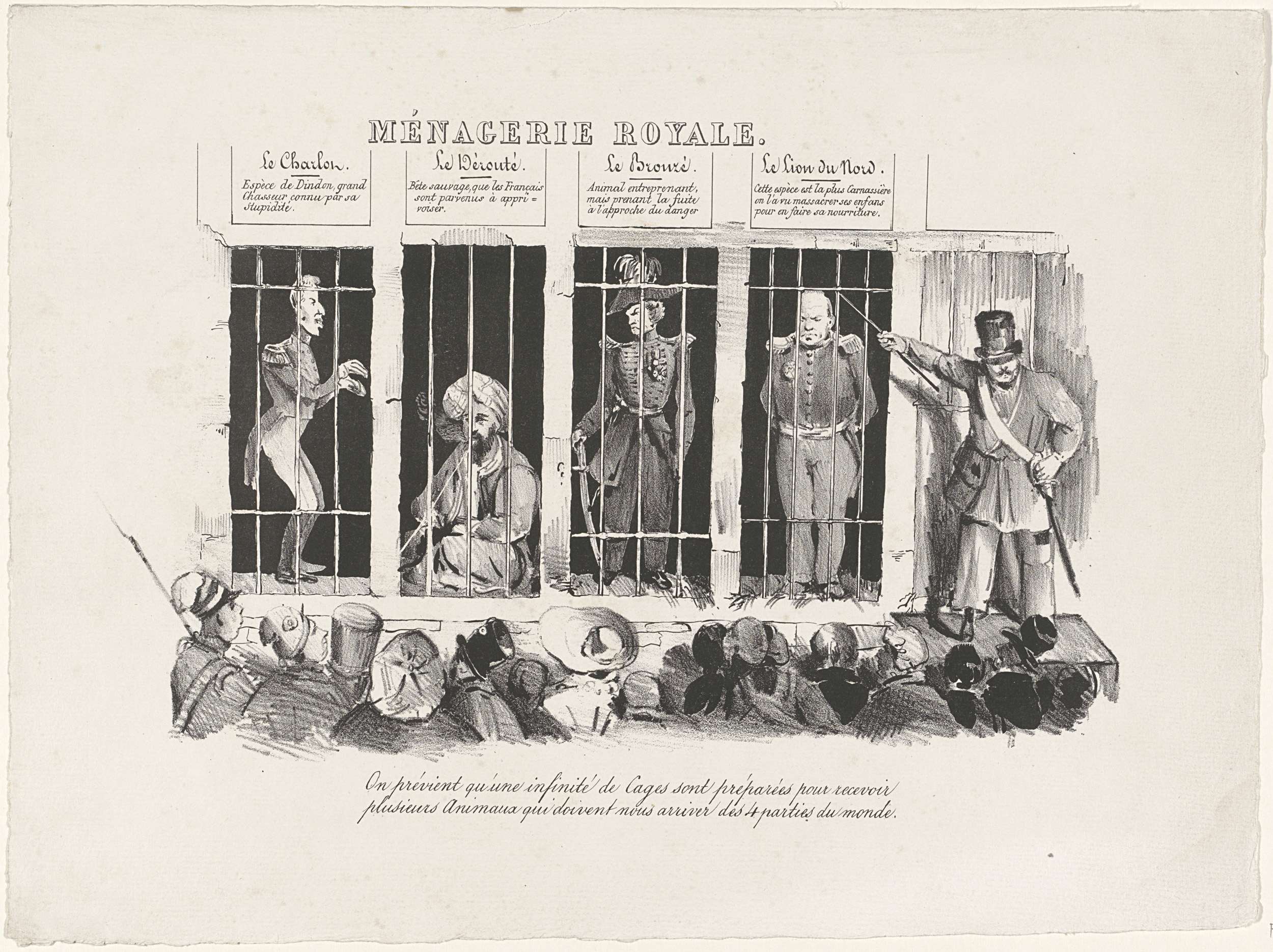 Spotprent waarin Jambe de Bois aan het Belgische publiek vier kooien met wilde beesten laat zien. In elke kooi zit een afgezet vorst. Rechts koning Willem I als 'le Lion du Nord'. In de andere drie kooien zitten 'Le Charlon'(Karel X), 'Le Dérouté (Hussein Dey van Algiers) en 'Le Bronzé' (Karel II hertog van Brunswijk). ...