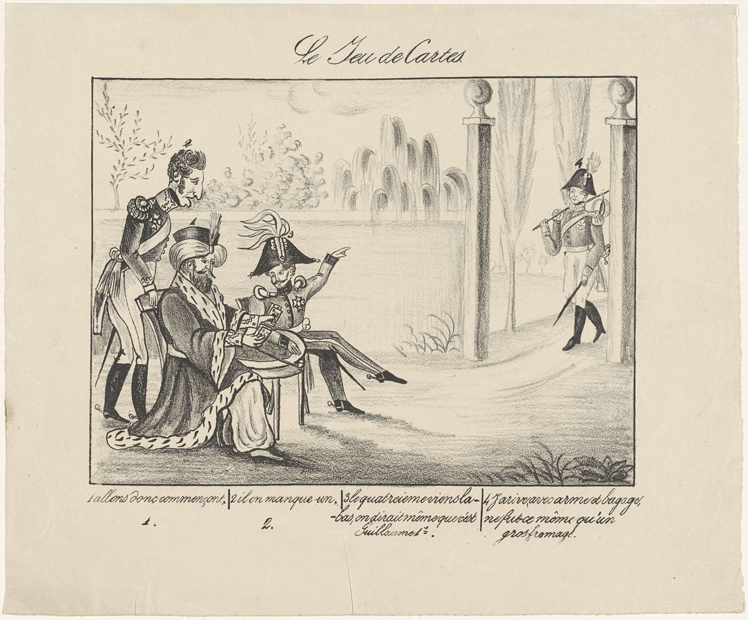 Spotprent op het verlies van België, 1830. Drie in 1830 afgezette vorsten, de Franse Karel X, Hussein Dey van Algiers en Karel II hertog van Brunswijk, rond een kaarttafel in een park wachtend op de vierde speler. Rechts komt koning Willem I aangelopen met een kaas aan een stok over de schouder. Met onderschriften 1-4.