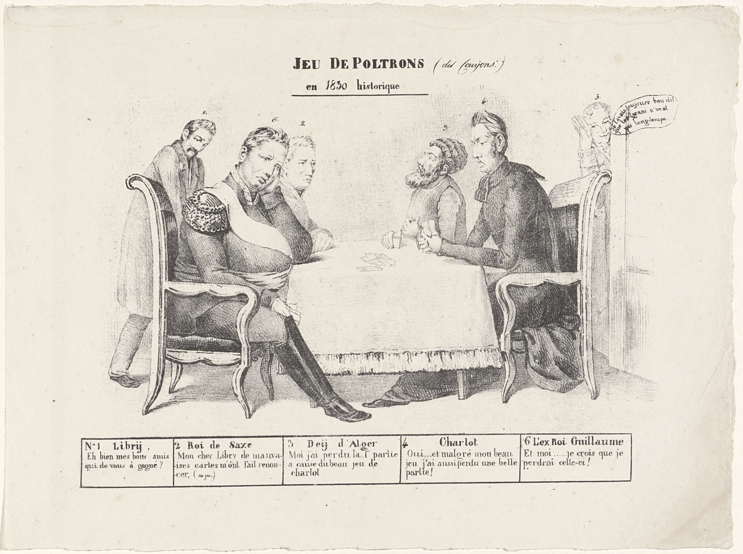 Spotprent op het verlies van België, 1830. Aan een tafel spelen vier in 1830 afgezette vorsten een kaartspel: koning Willem I, Anton, koning van Saksen, Hussein Dey van Algiers en Karel X van Frankrijk. Achter koning Willem I staat de uitgever George Libry. Rechts het hoofd van een lachende zesde persoon. Met onderschriften 1-6.