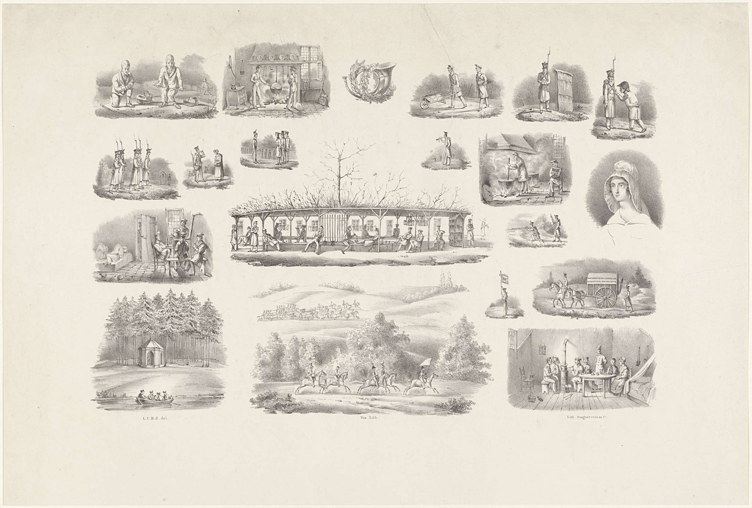 Blad met twintig kleine scènes uit het leven van vrijwillige jagers van de Universiteit Utrecht in een kantonnement van het Nederlandse leger in Noord-Brabant, 1830-1831. Centraal soldaten op de markt van Tilburg, links daarvan de wachtkamer in de Boschpoort te Bergen op Zoom. Rechts een militaire fouragewagen met het opschrift 'Kompagnie vryw jagers der utrechtsche ...