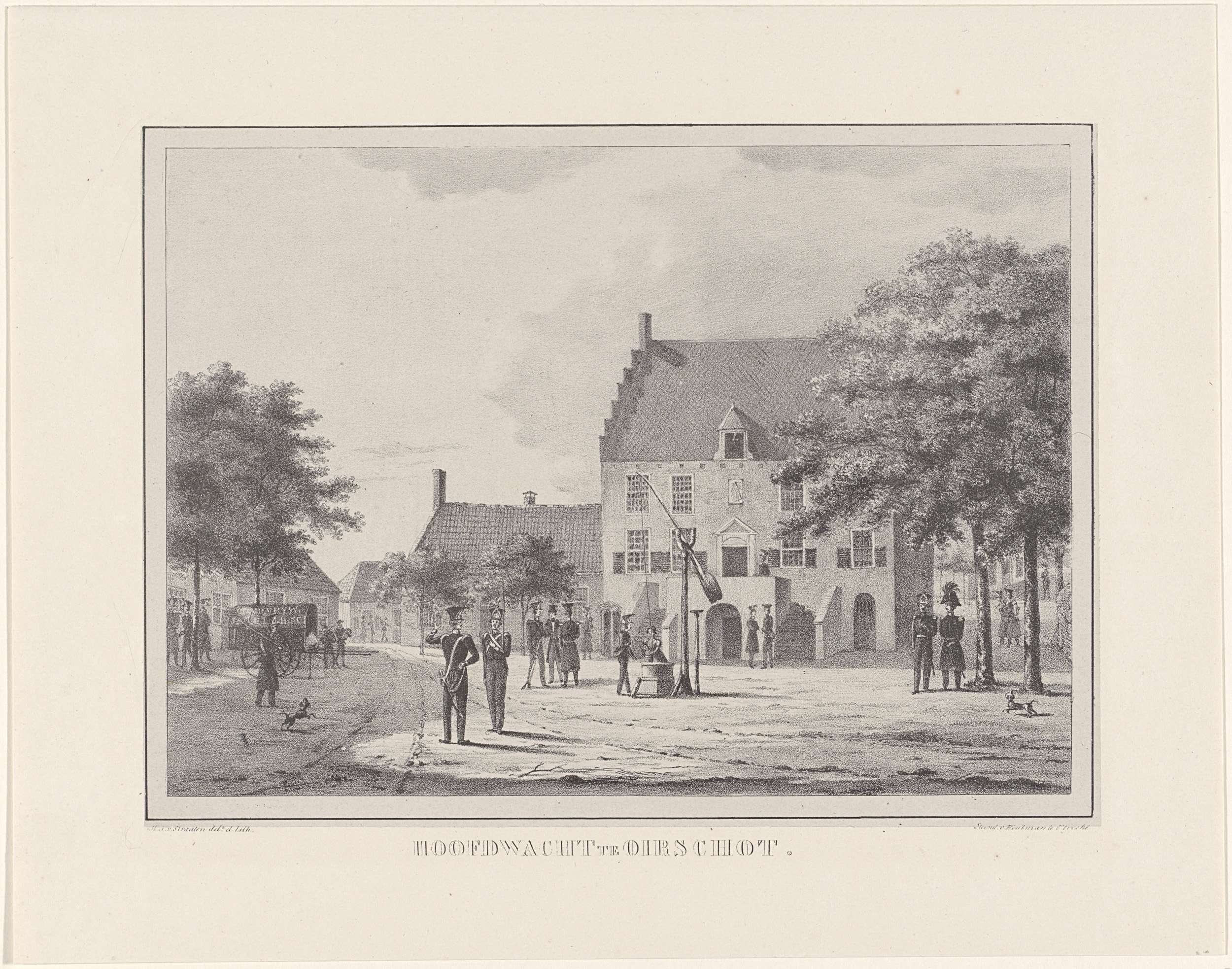 Gezicht te Oirschot met de wachtlokaal van de vrijwillige schutterij. Links een fouragewagen waarop de naam van een Hogeschool. Onderdeel van een serie van vier voorstellingen van de hoofdwachten van de Nederlandse schutterij in Noord-Brabant in 1830-1831.