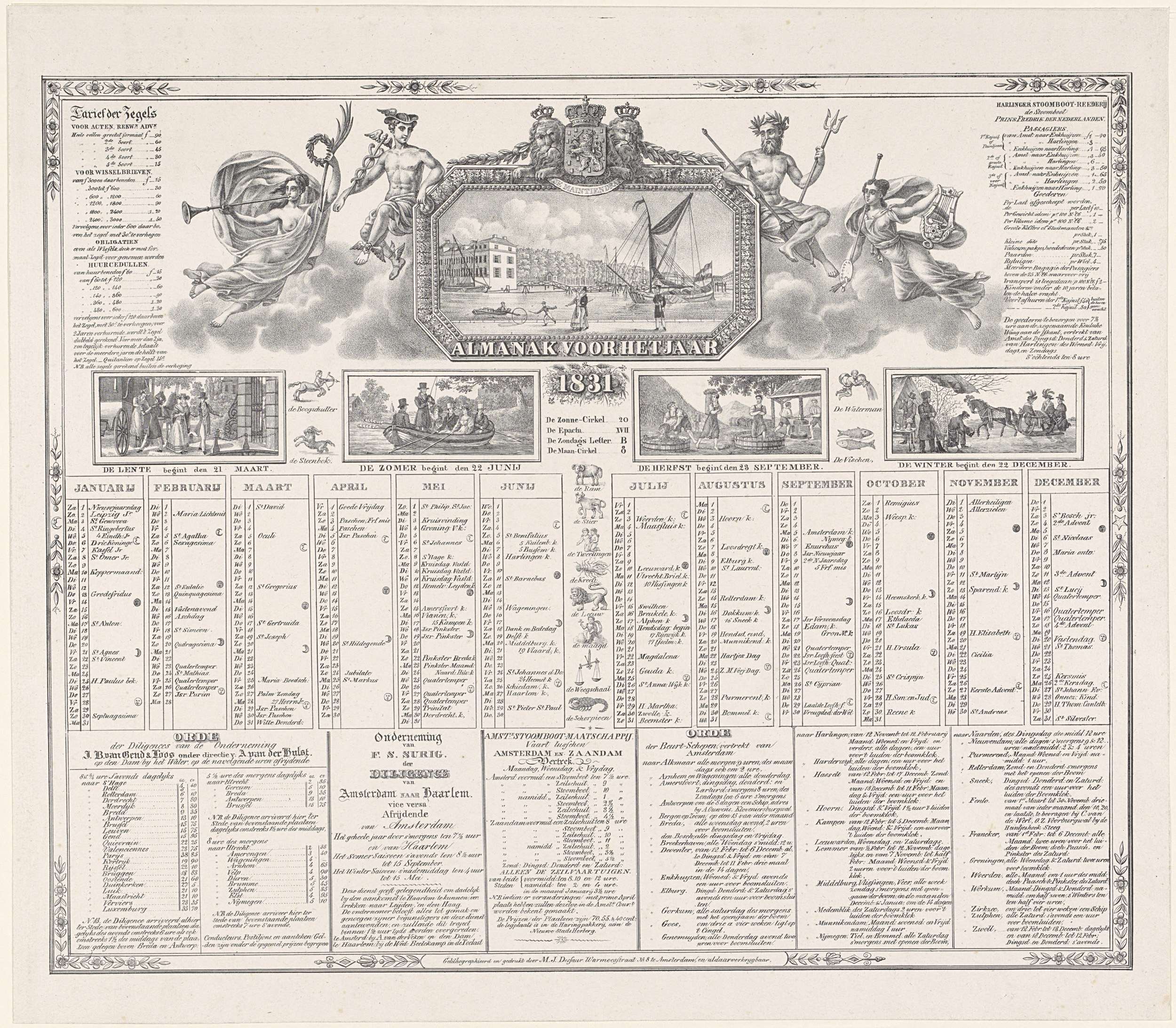 Almanak voor het jaar 1831. Centraal boven een gezicht op het Entrepôtdok te Amsterdam met aan weerszijden Mercurius en de riviergod van de Amstel, Faam en een vrouw met palet en lier. Hieronder voorstellingen van de vier seizoenen. Onderaan lijsten met de vertrektijden van verschillende diligences, de stoomboten en de beurtschepen.