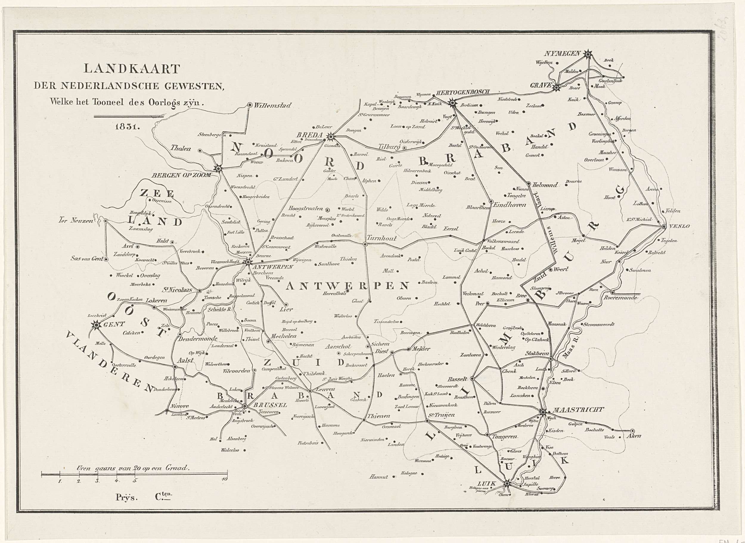Kaart van het oorlogsterrein in Noord-Brabant en de noordelijke Belgische provincies, 1831.