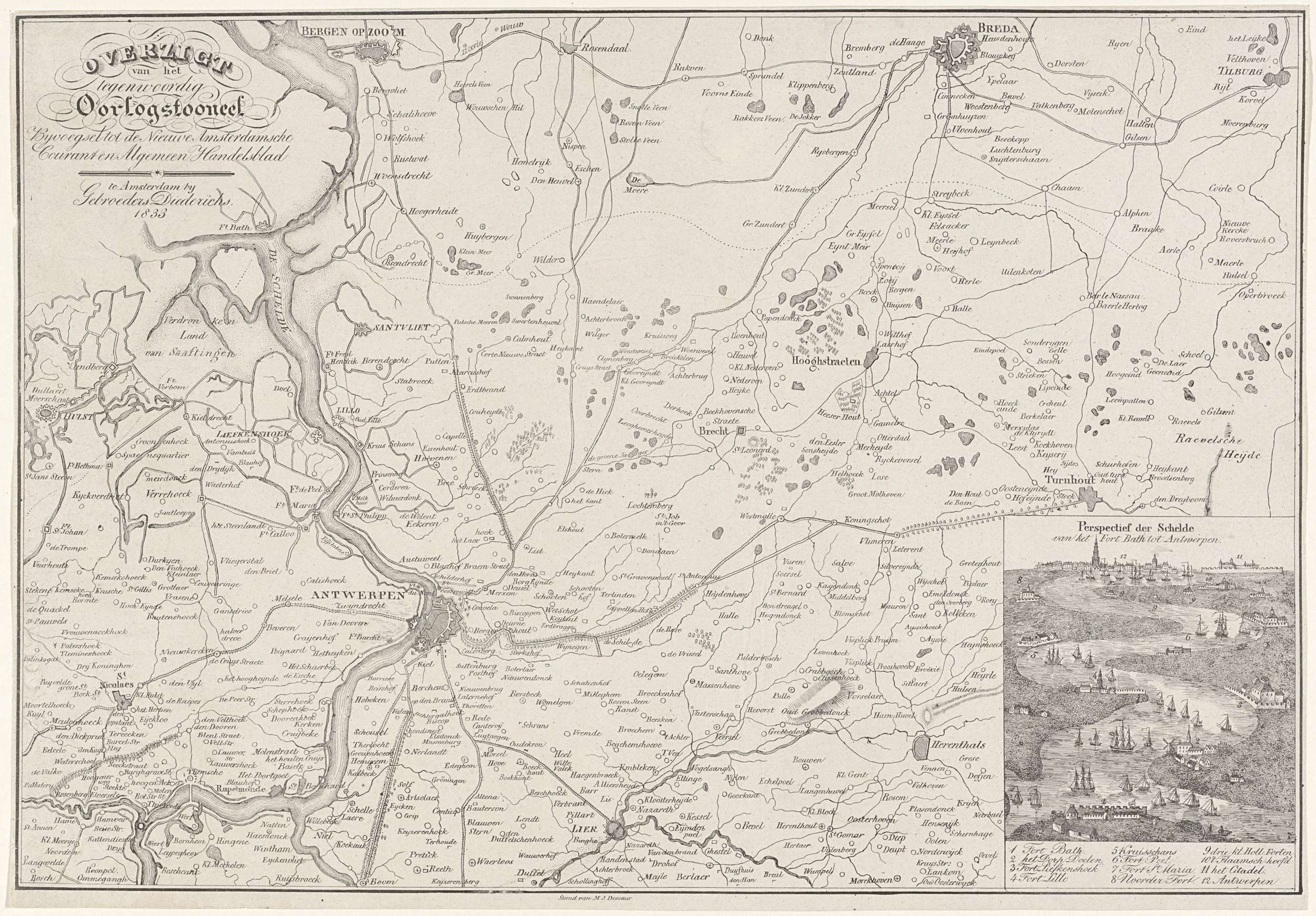 Kaart van het oorlogsterrein in Noord-Brabant en de noordelijke Belgische provincies, vooral tussen Antwerpen en Breda, 1832-1833. Rechtsonder een inzet met een gezicht op de loop van de Schelde van Fort Bath tot aan Antwerpen, ten tijde van de belegering van de Citadel in december 1832.