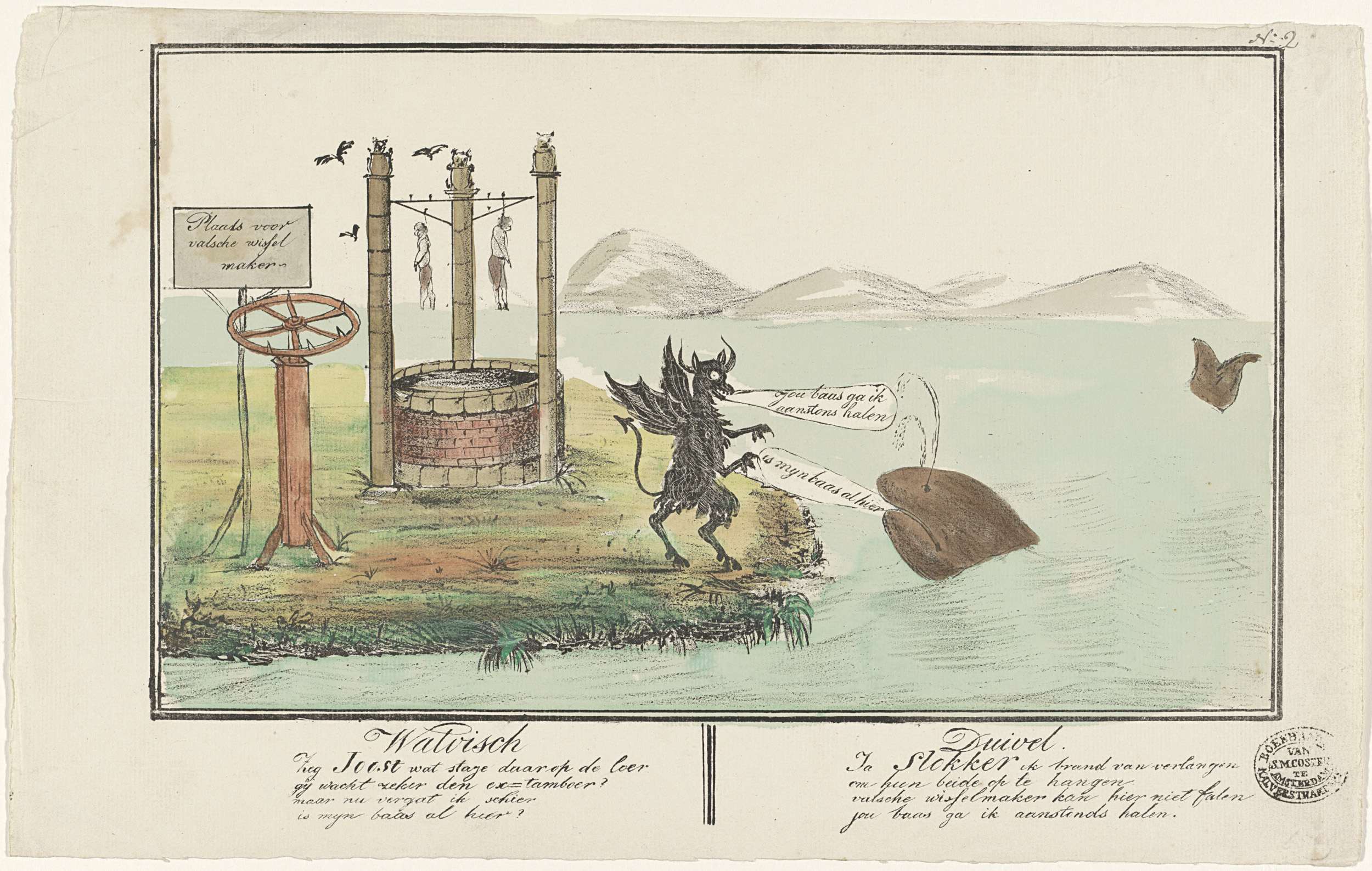 Spotprent op de Belgische generaals Daine en Kessels, 1830. Galgen met de lijken van enkele misdadigers, links een rad aangeduid als 'Plaats voor valsche wissel maker' (Daine). Rechts vraagt een walvis aan de duivel of zijn baas hier al is, de duivel antwoordt dat hij zo zijn baas (Kessels) gaat halen. In het onderschrift twee ...