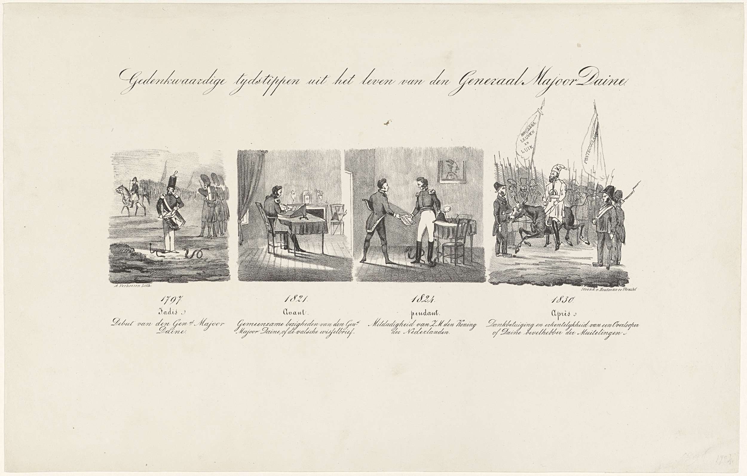 Spotprent op de generaal Daine, 1830-1831. Blad met vier gebeurtenissen uit het leven van de Nederlandse generaal in 1797 (Jadis: debuut als trommelslager), 1821 (Avant: schrijver van de valse wissels), 1824 (Pendant: vergiffenis door koning Willem I) en 1830 (Après: overgelopen naar het Belgische leger). In de laatste voorstelling van Daine als bevelhebber van de ...