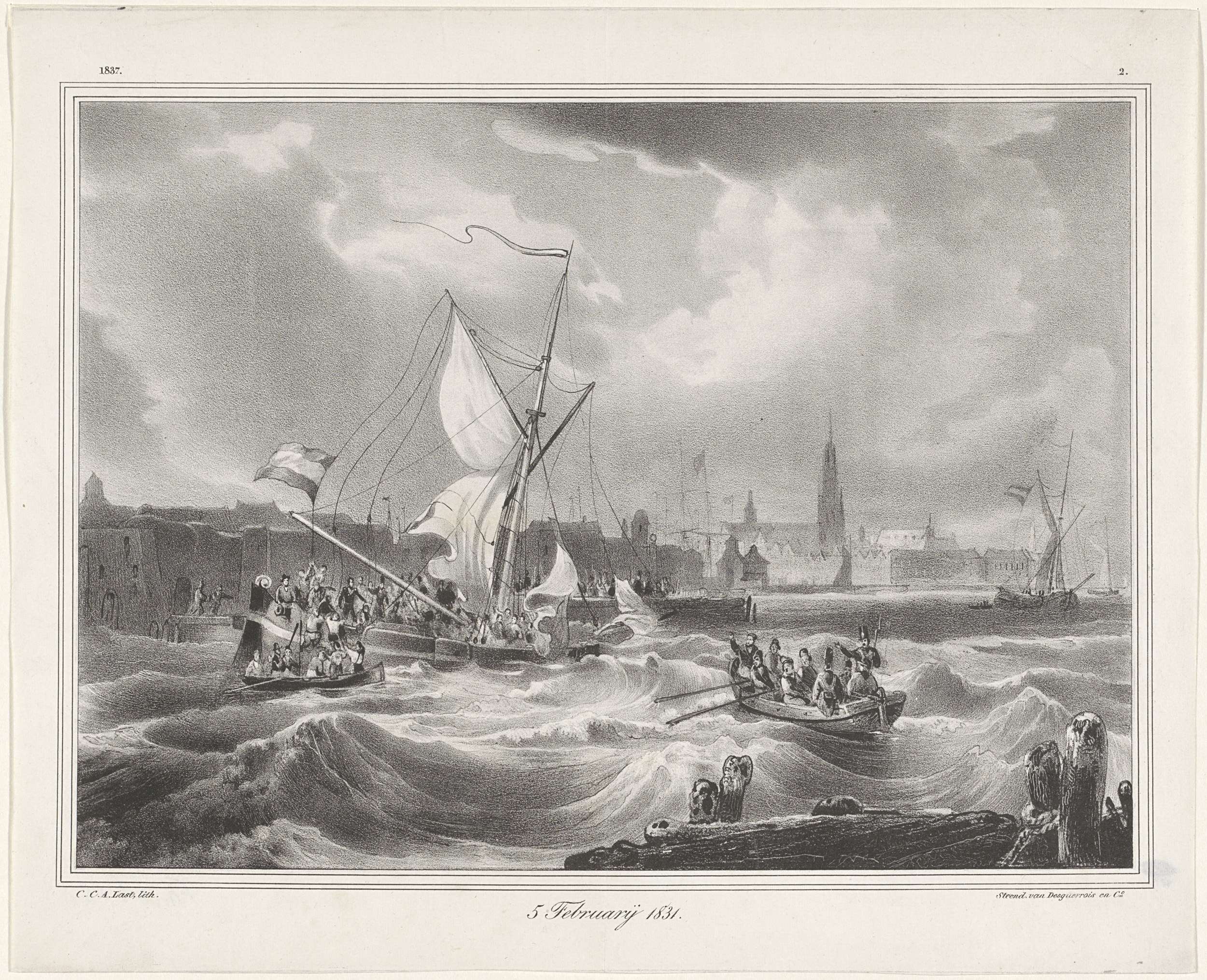 Gezicht op de Schelde met links de kanonneerboot van Jan van Speyk overrompeld door de Belgen, 5 februari 1831. Rechts een sloep die richting de kanonneerboot wordt geroeid. Van Speyk staat op het dek. In het onderschrift de datum. Bovenaan gedateerd 1837 en genummerd 2.