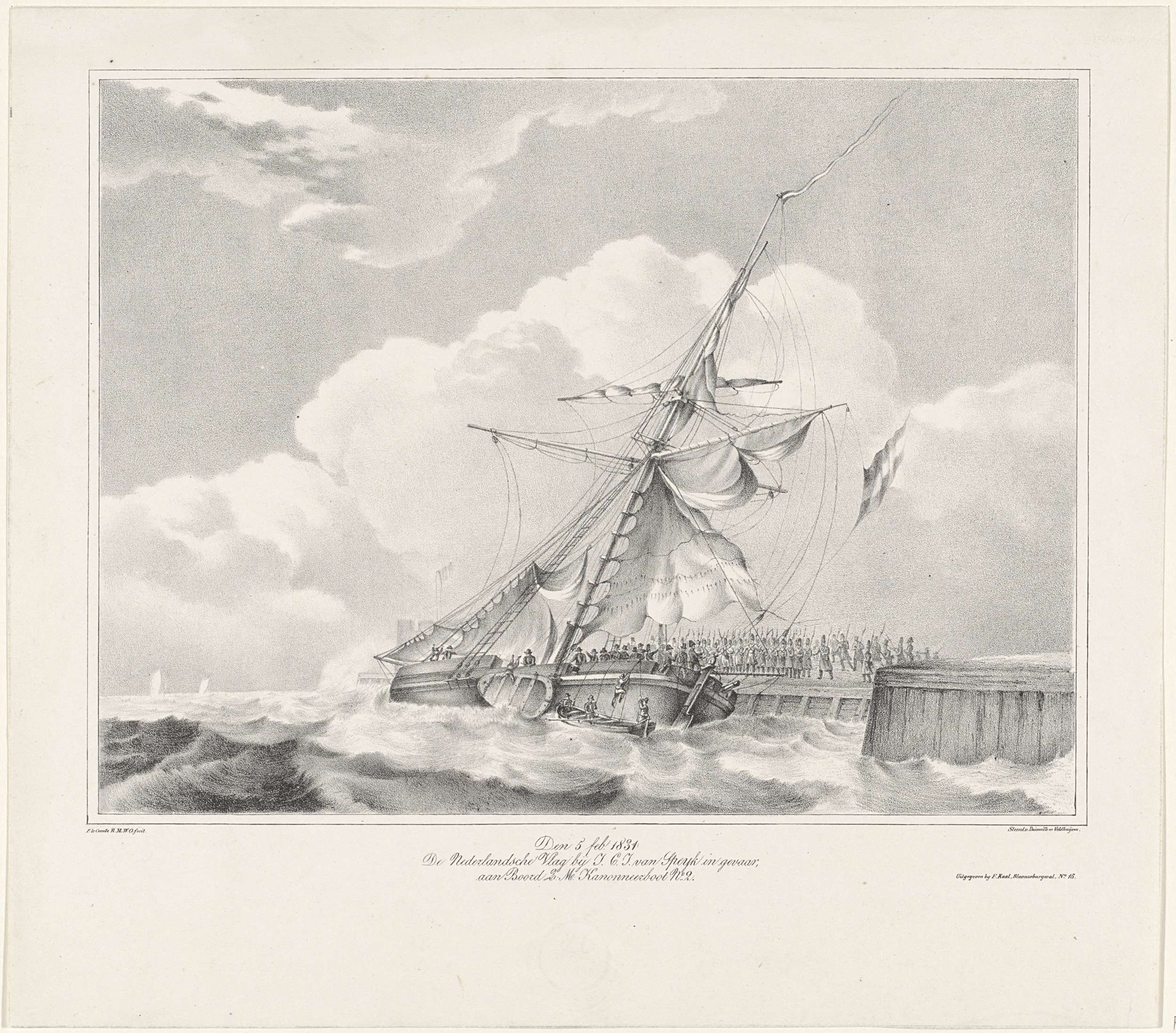 De kanonneerboot van Jan van Speyk nabij de kade waar een eenheid Belgische militairen staat, ondertussen klimmen Belgen vanuit een roeiboot aan boord, 5 februari 1831. Zie ook de pendant. Bij de beide platen behoort een tekstblad met uitlegging van de voorstelling.