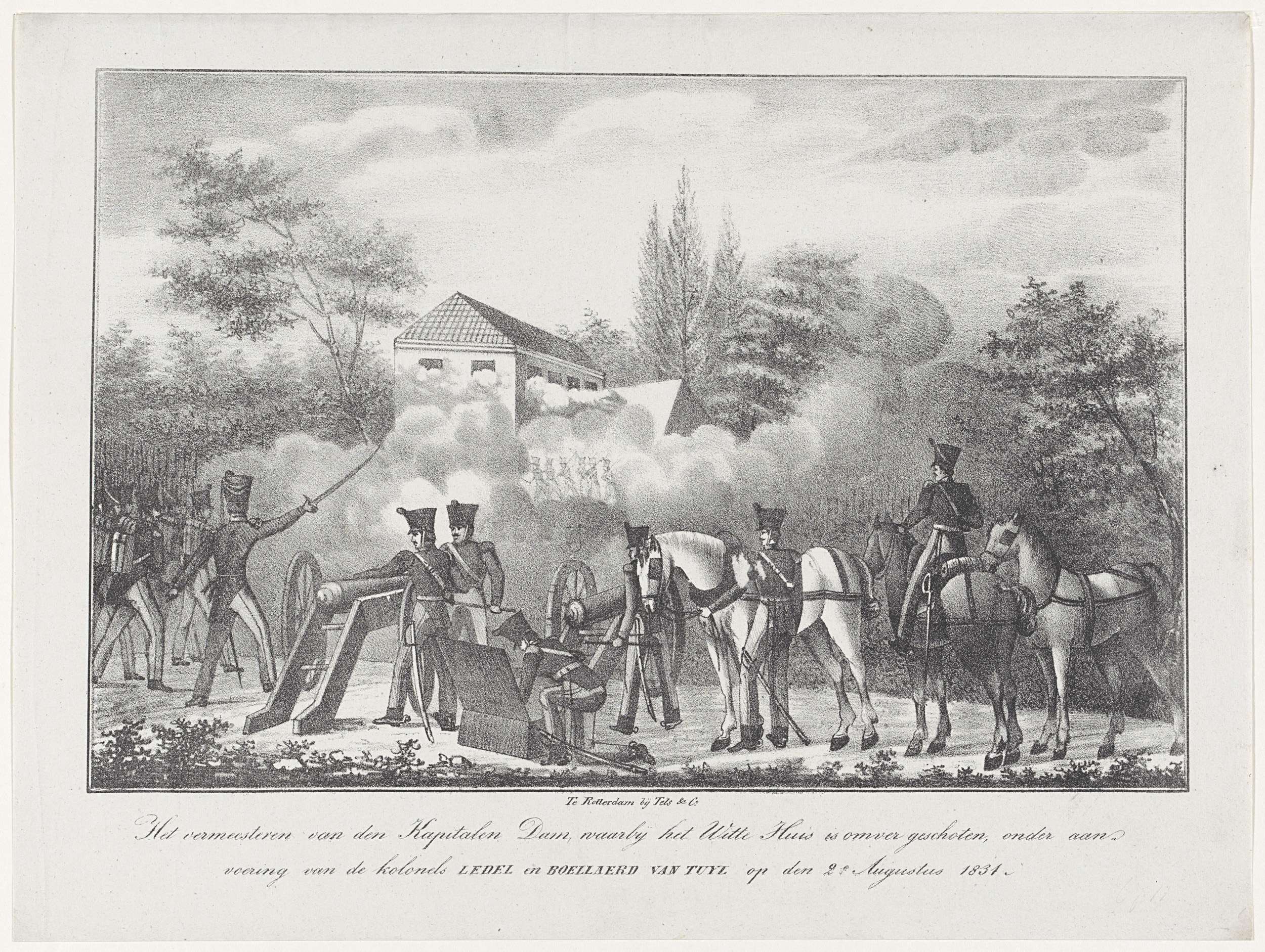 Verovering van de Kapitalen Dam - een dam bij Sluis in Staats-Vlaanderen - en het Witte Huis door Nederlandse troepen, 2 augustus 1831. De Nederlandse troepen onder bevel van kolonel Joseph Ledel en kolonel Boellaerd van Tuyl. Tijdens de Tiendaagse Veldtocht, 2-12 augustus 1831.