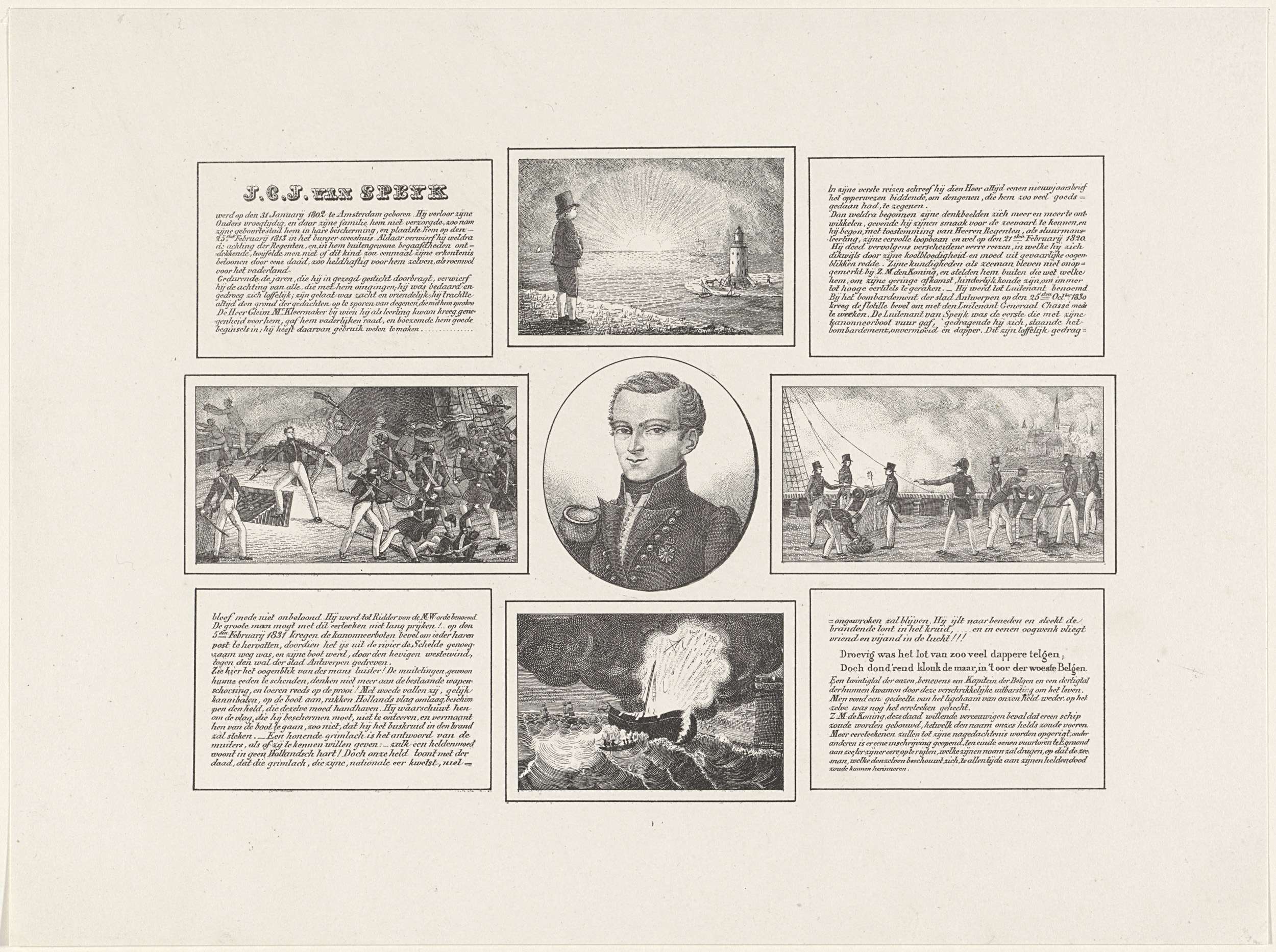 Blad met vier voorstellingen uit het leven van Jan van Speyk met in het midden een ovaal portret. Bovenaan Van Speyk als kind, daaronder deelname van de kanonneerboot aan het bombardement van Antwerpen in 1830 en de bestorming van de boot door Belgen, onderaan het ontploffen van de boot op de Schelde voor Antwerpen, 5 ...